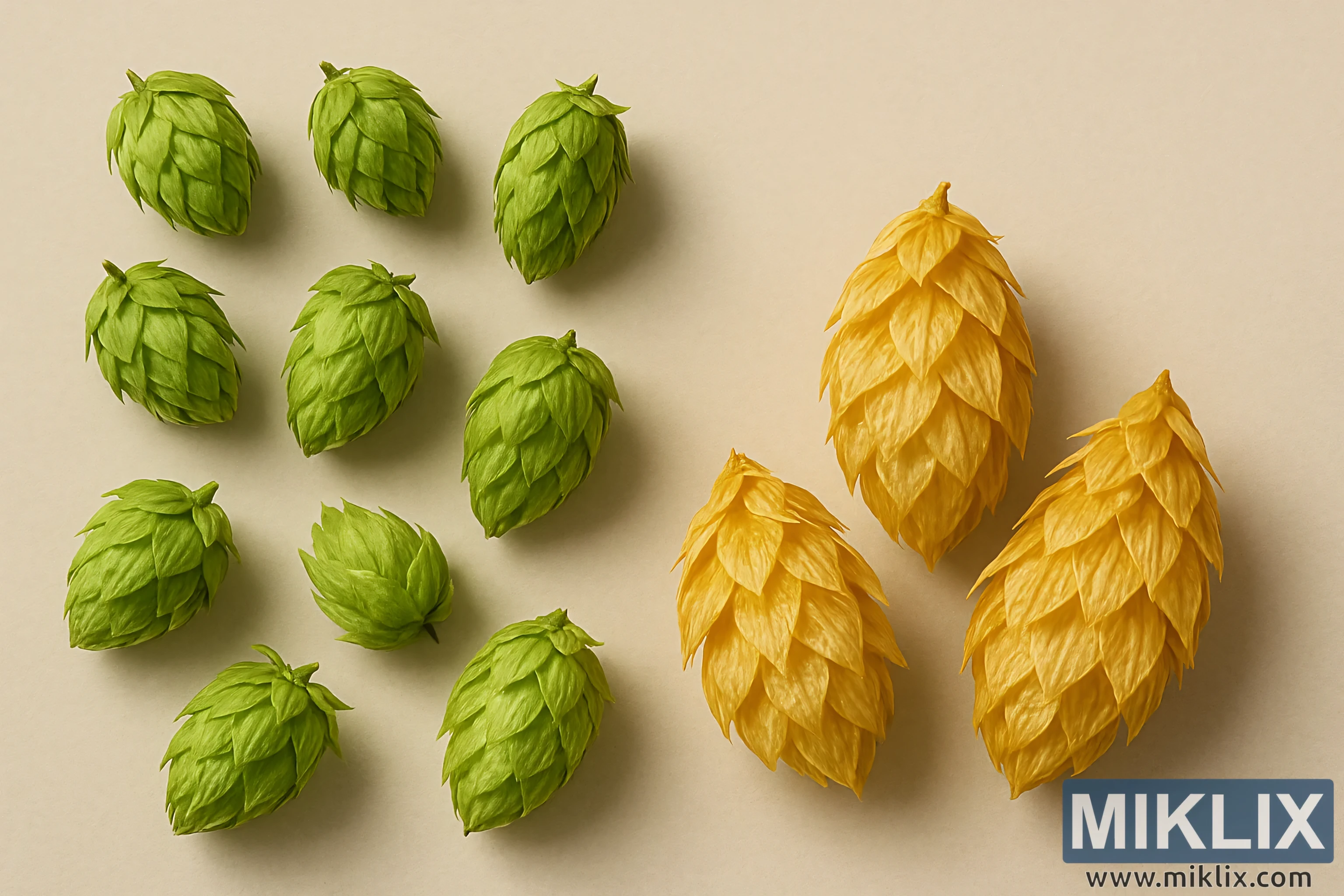Di sebelah kanan, bagaimanapun, lompat Kristal serta-merta menarik mata. Nada keemasan mereka jelas berbeza dengan hijau sejuk di sebelah mereka, warna mereka hampir bercahaya seolah-olah diterangi dari dalam. Bracts kon ini kelihatan lebih memanjang dan lut sinar, dengan variasi halus dalam teduhan yang berjulat daripada ambar madu hingga kuning yang diterangi matahari. Palet keemasan ini bukan sahaja menyampaikan keistimewaan estetiknya tetapi juga identiti pembuatan birnya—Crystal hop terkenal dengan sumbangannya yang halus dan bernuansa, menawarkan nota bunga lembut, pedas dan berkayu berbanding tumbukan berani sitrus atau pain yang terdapat dalam jenis lain. Penempatan mereka selain daripada kelompok lompat hijau menekankan peranan mereka sebagai kepelbagaian yang merapatkan tradisi dan penghalusan, merangkumi kehalusan dan keseimbangan dan bukannya keamatan.