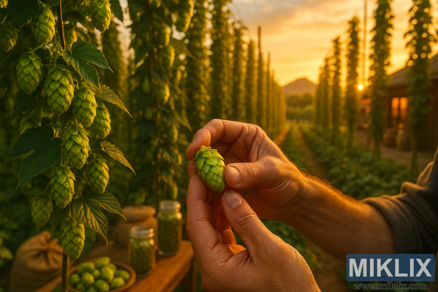 Pemandangan jam emas di halaman hop yang luas di mana seorang petani dengan lembut memeriksa kon hop Phoenix. Sarang hijau yang subur, gugusan masak dan bangunan desa melengkapkan suasana, melambangkan kerajinan dan tradisi pembuatan bir.