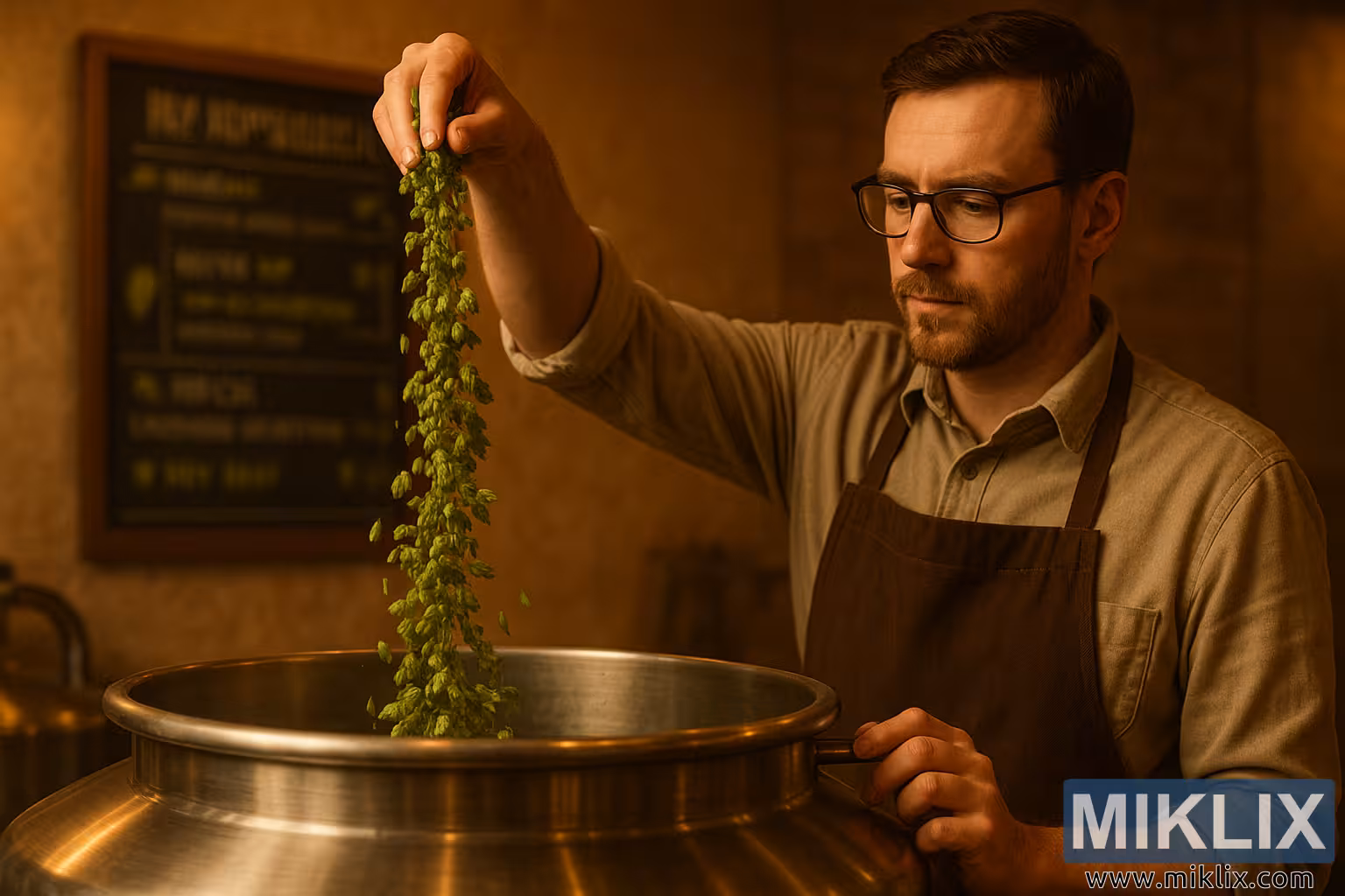 Latar belakang menambah tekstur dan kedalaman pada naratif. Menu papan tulis tergantung di dinding, nota tulisan tangannya membayangkan keluasan tawaran kilang bir dan pelbagai jenis lompat yang mentakrifkannya. Perkataan dan angka kabur menjadi fokus lembut, tetapi kehadirannya menggariskan dialog berterusan antara eksperimen dan tradisi. Nada tanah dinding yang diredam, ditambah dengan cahaya keemasan yang hangat, mewujudkan suasana yang terasa desa dan kontemporari, tempat di mana ketukangan dunia lama bertemu dengan budaya pembuatan bir moden. Cahaya menyelubungi pembuat bir dan ruang kerjanya dalam cahaya yang menyerlahkan bukan sahaja butiran fizikal—kilat logam, hijau hop—tetapi juga suasana dedikasi dan kesenian yang tidak ketara.