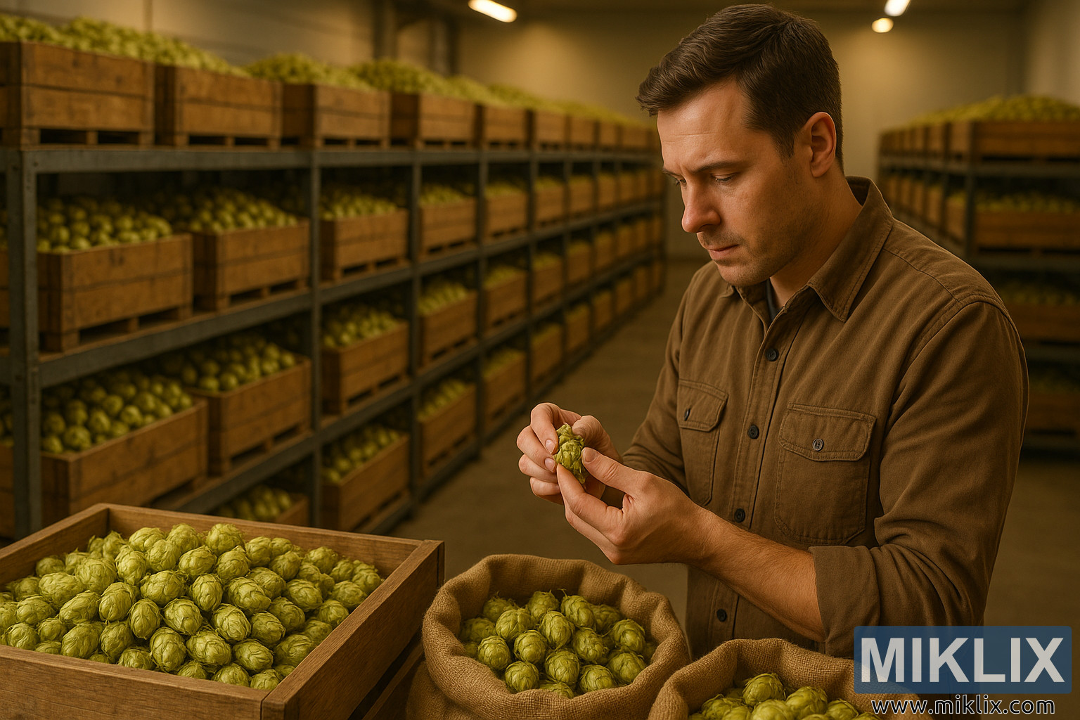 Latar belakang mengukuhkan rasa tertib dan ketepatan. Gudang bersih, barisan peti sejajar dengan simetri yang bercakap dengan disiplin dan penjagaan. Tumpahan cahaya hangat dari lekapan atas, melembutkan garisan industri pada rak dan dinding, mengubah ruang menjadi satu yang terasa mesra dan bukannya terang. Pencahayaan bukan sahaja menyerlahkan hop tetapi juga menambah kedalaman, menarik perhatian kepada skala operasi semata-mata sambil masih membenarkan tindakan pemeriksaan intim di latar depan kekal sebagai tumpuan utama. Keseimbangan skala dan perincian yang teliti ini mencerminkan proses pembuatan bir itu sendiri: luas dan industri dalam beberapa aspek, namun bergantung pada detik-detik yang tidak terkira banyaknya pertimbangan manusia yang teliti dan penilaian deria.