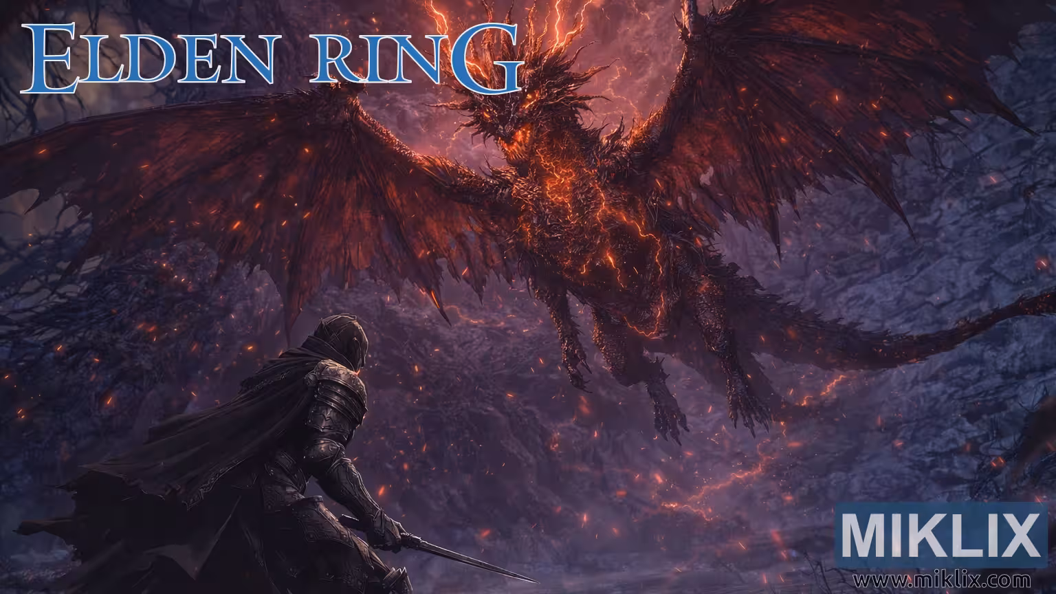 Butiran halus memperkayakan pemandangan: siluet samar runtuhan purba di latar belakang mengisyaratkan sejarah tragis Deeproot Depths; pendirian pahlawan itu membangkitkan keberanian dan keputusasaan; dan sayap naga yang retak menunjukkan makhluk yang terkoyak di antara alam. Tera air "MIKLIX" dan laman web "www.miklix.com" di sudut mengesahkan identiti artis, manakala tajuk "ELDEN RING" di bahagian kiri atas menambat imej dalam alam semesta mitosnya.