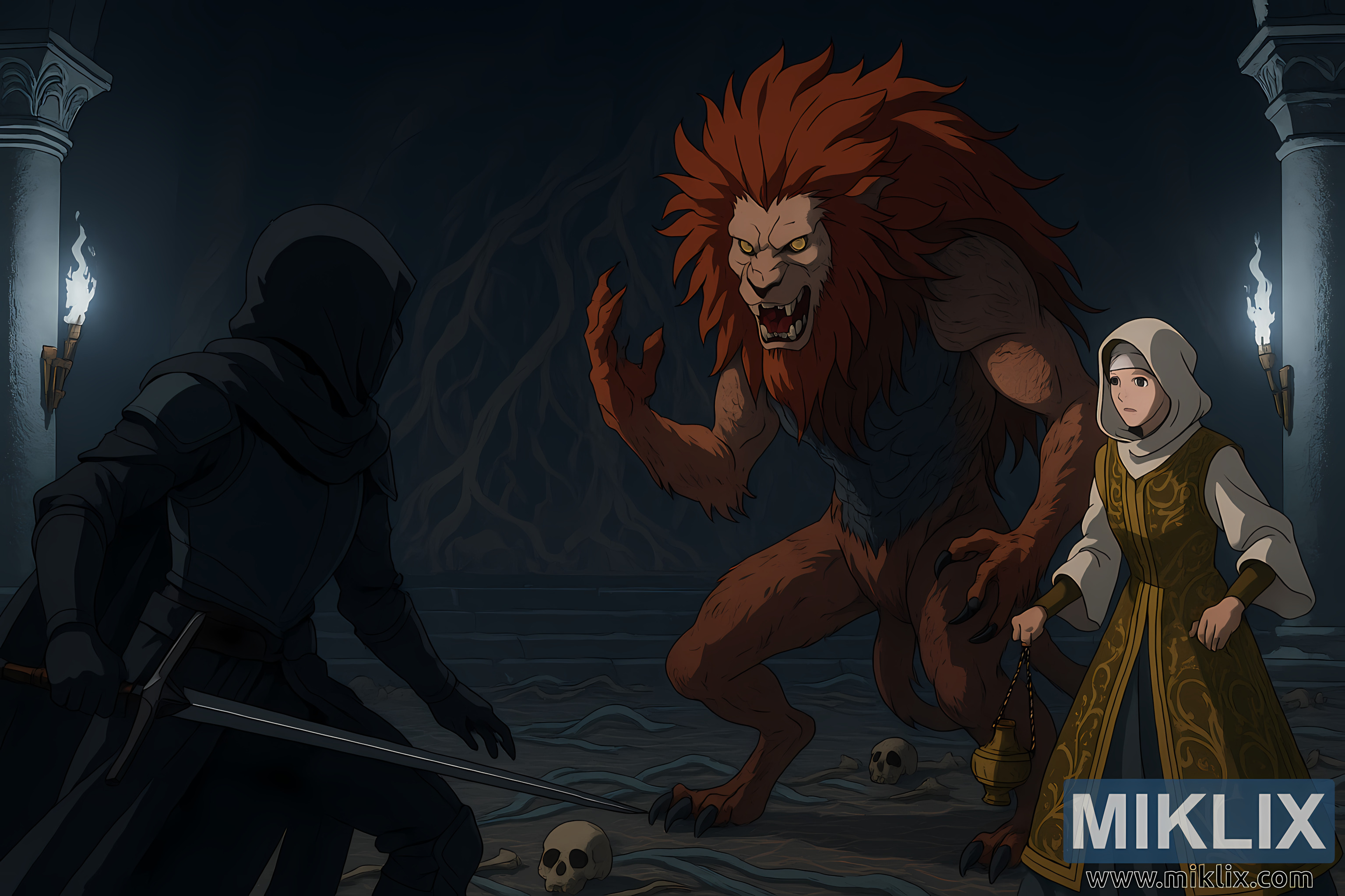 Persekitaran itu meningkatkan suasana yang tidak menyenangkan: lantai batu dipenuhi dengan tengkorak dan tulang yang berselerak, sisa-sisa pahlawan yang gugur tanpa henti. Akar tebal menyelubungi dinding gua, menunjukkan pereputan dan kerosakan kuno. Tiang batu yang tinggi membingkai pemandangan di kedua-dua belah pihak, setiap satunya membawa obor yang memancarkan api putih kebiruan yang sejuk. Pencahayaan yang sejuk ini sangat berbeza dengan cahaya hangat bulu Misbegotten dan api Tricia, mewujudkan interaksi warna dan atmosfera yang menarik. Secara keseluruhan, imej itu merakam momen pertempuran yang akan datang, kaya dengan ketegangan, skala, dan penceritaan fantasi gelap.