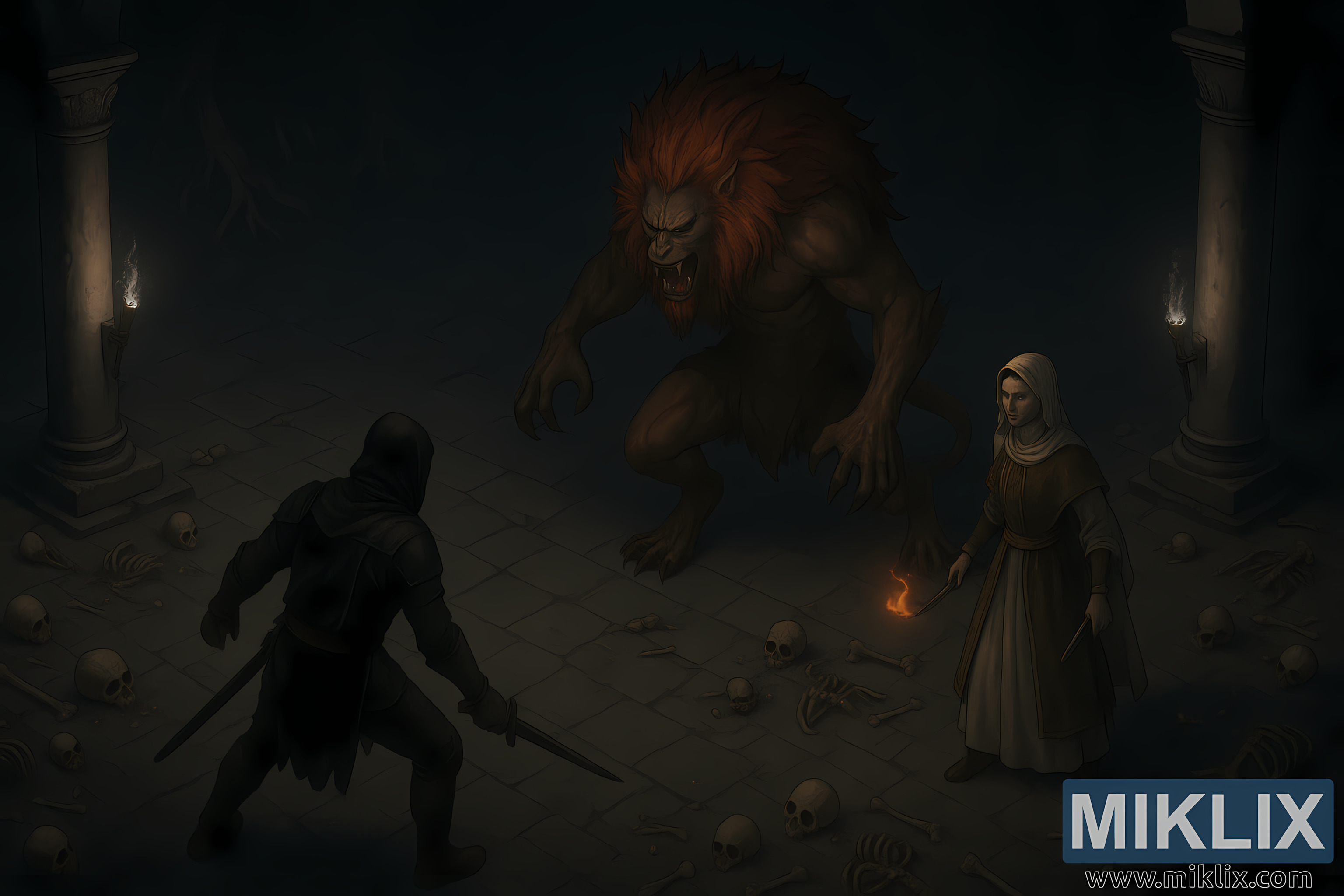 Imej tersebut menggambarkan konfrontasi tegang yang dihasilkan dalam gaya fantasi gelap dengan estetika separa realistik yang terkawal dan bukannya bentuk kartun yang dibesar-besarkan. Adegan ini dibentangkan dalam orientasi landskap yang luas dan dilihat dari sudut isometrik yang ditarik ke belakang dan dinaikkan, membolehkan persekitaran penuh dan kedudukan watak difahami dengan jelas. Latarnya ialah ruang batu bawah tanah yang luas, lantai jubinnya retak dan tidak rata akibat usia dan pengabaian. Bertaburan di atas tanah ialah tengkorak, sangkar tulang rusuk, dan tulang yang longgar, mewujudkan peringatan suram tentang pahlawan yang gugur tanpa henti dan memberikan ruang itu rasa kematian yang berat.