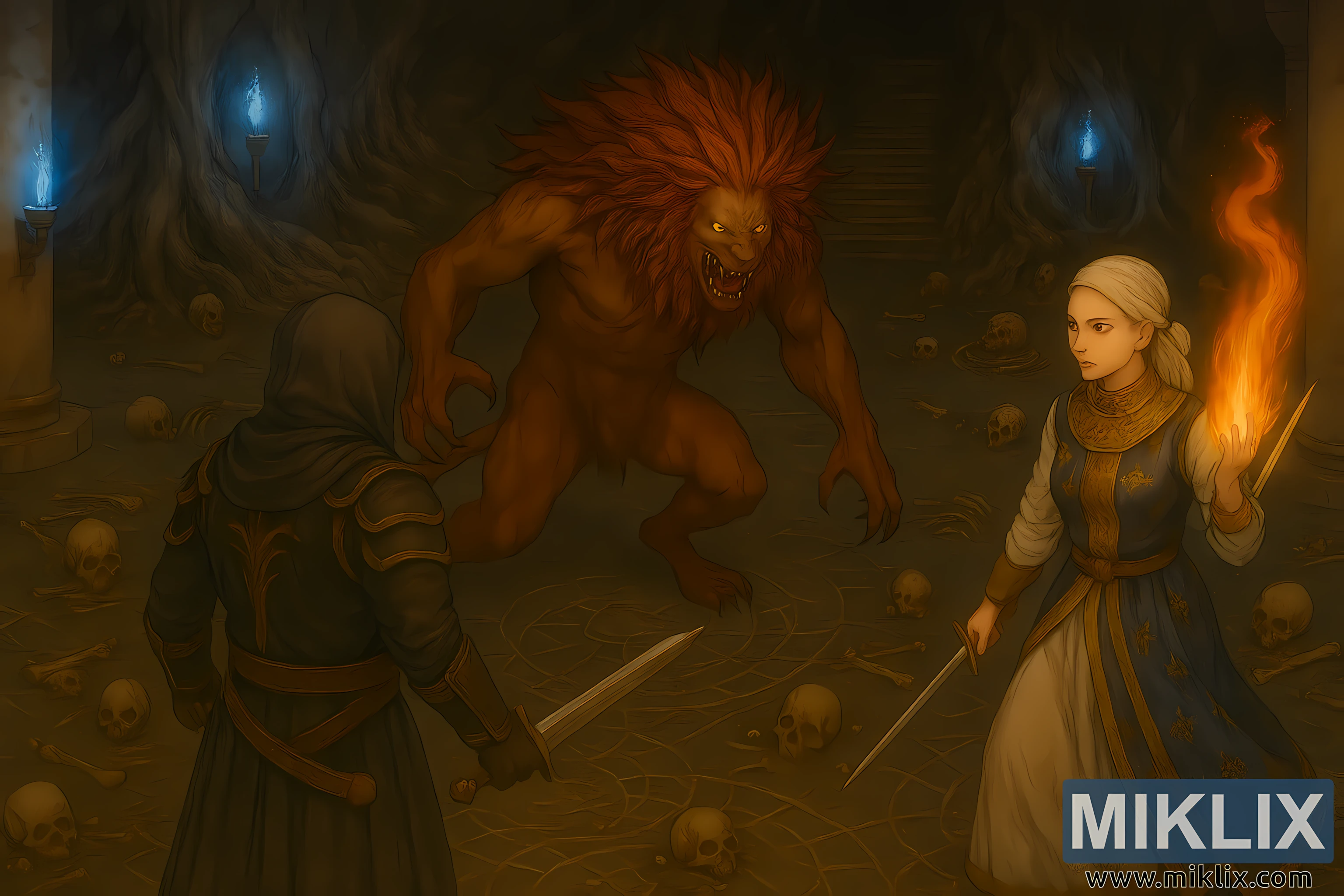 Lukisan digital separa realistik ini merakamkan detik konfrontasi yang menegangkan di penjara bawah tanah kuno yang gelap yang diinspirasikan oleh Elden Ring. Dipersembahkan dalam orientasi landskap, komposisi ini menampilkan tiga watak yang terkunci dalam perselisihan segi tiga, dikelilingi oleh seni bina yang menakutkan dan pencahayaan atmosfera.