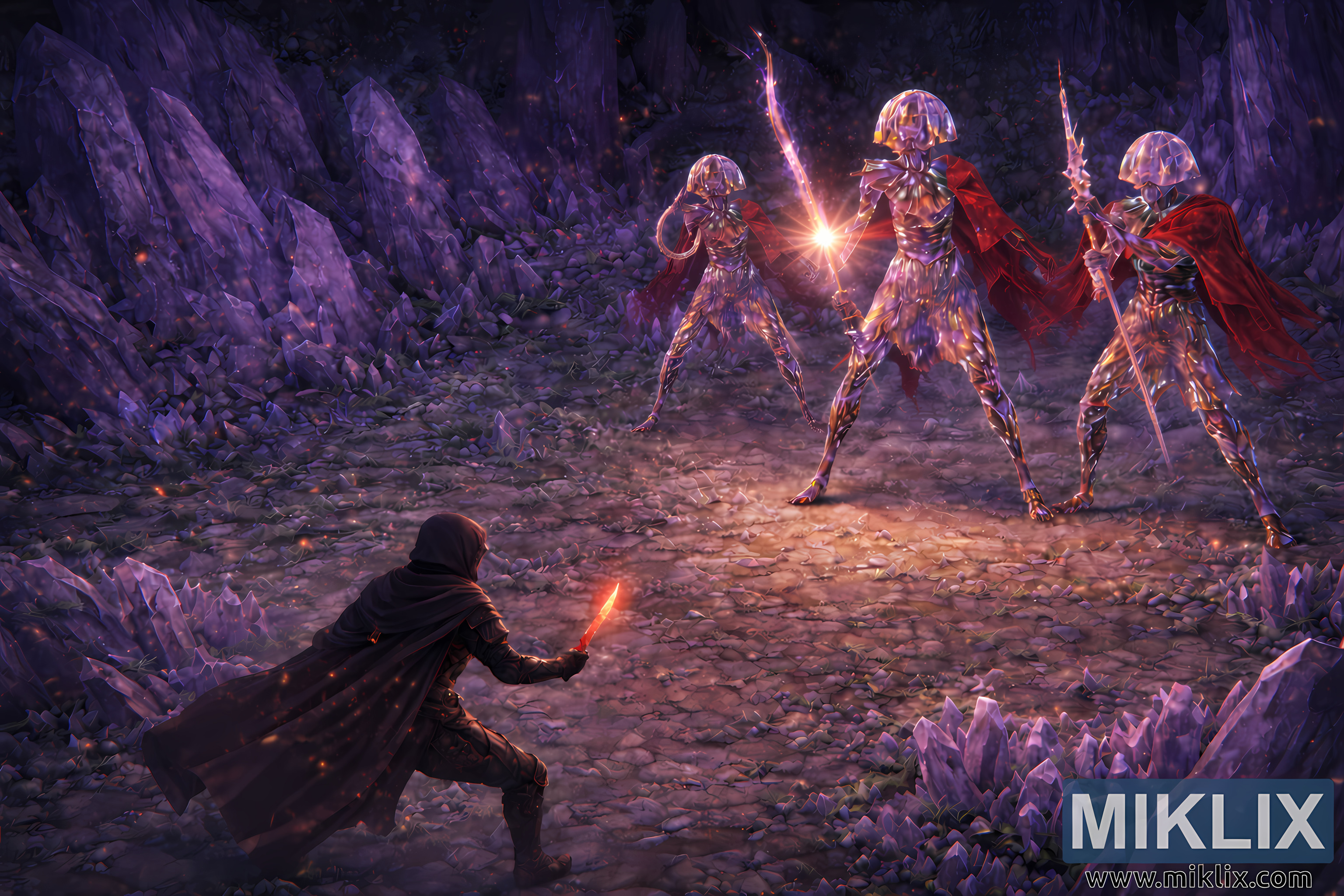 Persekitaran gua itu meningkatkan lagi drama pertemuan itu. Menara kristal bergerigi meletus dari dinding dan lantai, mewujudkan amfiteater semula jadi batu ungu. Serpihan kecil menutupi tanah seperti kaca yang pecah, menangkap pancaran cahaya yang sesat. Kabus nipis melayang melintasi medan perang, melembutkan tepi rupa bumi dan menambah kedalaman ketika ia melilit but Tarnished dan kaki Crystalian yang memanjang. Batang cahaya malap turun dari rekahan yang tidak kelihatan di atas, bersilang dengan cahaya prisma trio itu dan kehangatan berapi-api bilah Tarnished, membasahi pemandangan itu dengan interaksi kompleks warna merah hangat dan ungu sejuk.
