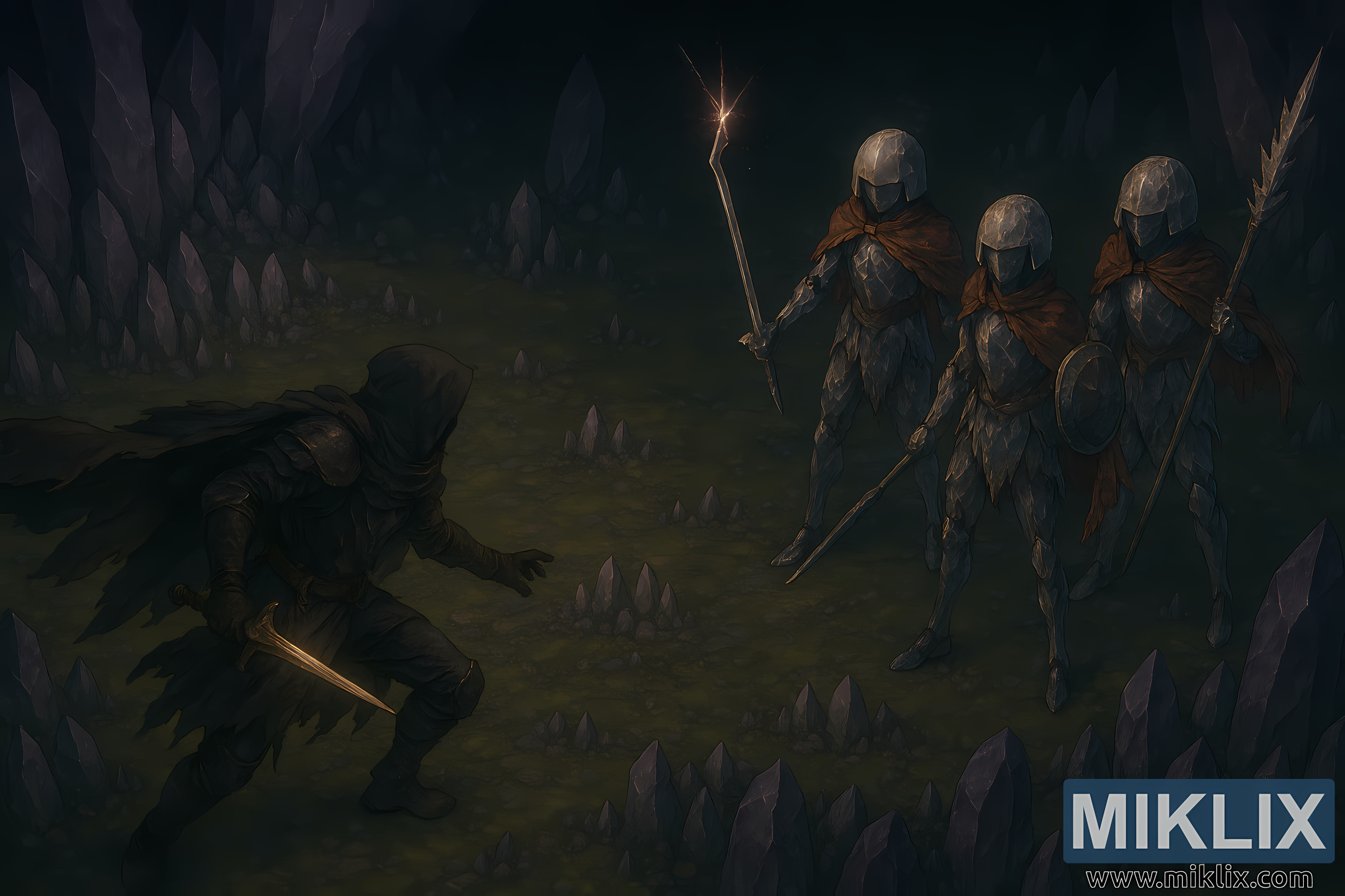 Gua itu sendiri merupakan pemandangan menakjubkan dengan formasi kristal bergerigi yang meletus dari tanah dan dinding. Formasi ini bersinar dengan warna ungu dan biru lembut, memancarkan cahaya halus ke seluruh lantai yang dilitupi lumut dan memantulkan perisai dan senjata para pejuang. Serpihan kristal yang lebih kecil berselerak di seluruh kawasan, menambah tekstur dan kedalaman. Latar belakangnya pudar menjadi bayang-bayang, menunjukkan skala dan misteri gua yang sangat besar.
