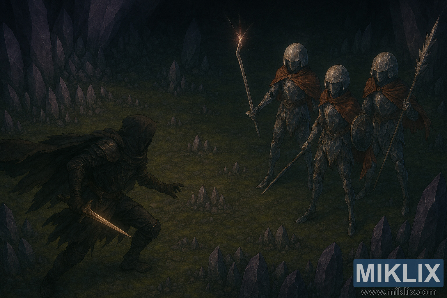 Seni peminat yang diinspirasikan oleh anime ini merakam pertempuran klimaks dalam Elden Ring: Shadow of the Erdtree, yang berlatarkan kedalaman Sellia Hideaway yang menghantui. Dihasilkan dalam resolusi tinggi dan orientasi landskap, imej ini menggunakan perspektif isometrik yang ditarik ke belakang dan dinaikkan yang mendedahkan skop penuh gua kristal dan susun atur taktikal pertemuan tersebut.