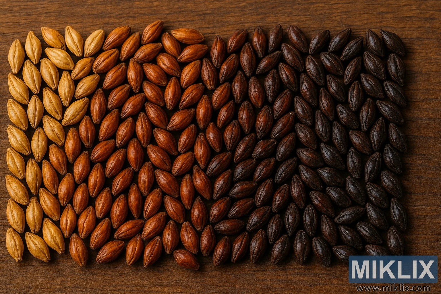 ကြွယ်ဝသော အကြမ်းထည်ရှိသော သစ်သားမျက်နှာပြင်ပေါ်တွင် ဖြန့်ကျက်ထားသော ဤပုံသည် အိမ်တွင်းဘရူးဘီယာတွင် အသုံးပြုသည့် အထူးထုတ်ပိုးမယ်လ်သီးများ၏ အချိုးအစားကျနသော အလှကို တမင်တကာနှင့် အမြင်အာရုံဖြင့် ဆွဲဆောင်မှုရှိသော gradient ဖြင့် စီစဉ်ပေးပါသည်။ malt များကို ခြားနားသော အလျားလိုက် အတန်းလေးခုတွင် ခင်းကျင်းထားပြီး တစ်ခုစီသည် မတူညီသော caramelization နှင့် ကင်သည့် အဆင့်ကို ကိုယ်စားပြုကာ၊ ဘယ်ဘက်ရှိ အပေါ့ပါးဆုံး ရွှေအရောင်မှ ညာဘက်ရှိ အနက်ရောင်နီးပါးအထိ တိုးလာပါသည်။ ဤအရောင်ဖျော့ဖျော့သည် အမြင်အာရုံပွဲတစ်ခုအဖြစ်သာမက ဘီယာချက်လုပ်သူများအတွက် ရရှိနိုင်သော အရသာရောင်စဉ်၏ ထိတွေ့မှုကို ကိုယ်စားပြုသည့်အနေဖြင့် မုယောစပါးကို အပူနှင့်အချိန်ဖြင့် အသွင်ပြောင်းခြင်းကို ပြသသည်။