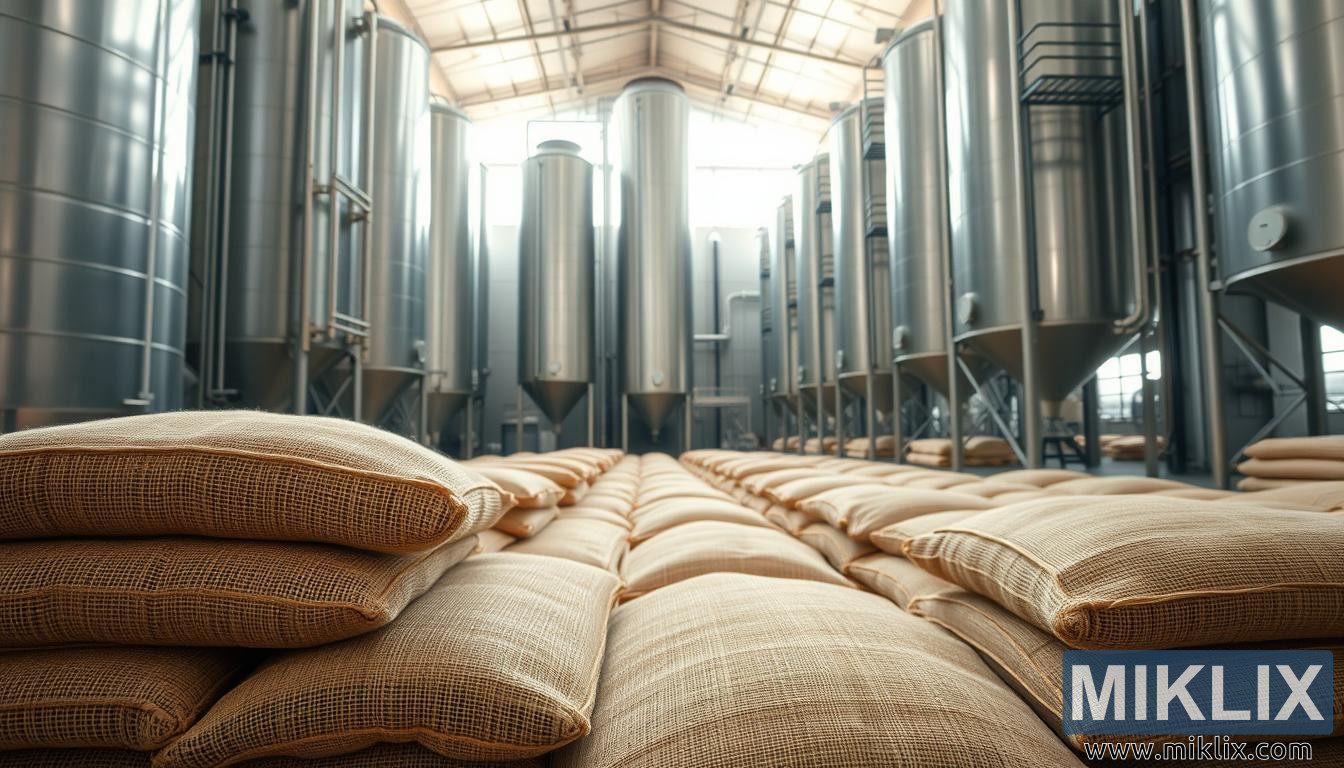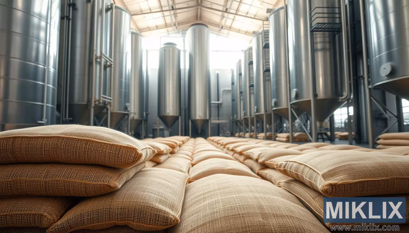 ကျယ်ဝန်းသော malt သိုလှောင်သည့် စက်ရုံသည် ဖျော့တော့သော malt အိတ်များ၊ အရပ်ရှည်သော သံမဏိ silos နှင့် racking စနစ်များပါရှိသော ကျယ်ဝန်းသော malt သိုလှောင်သည့် စက်ရုံ၊