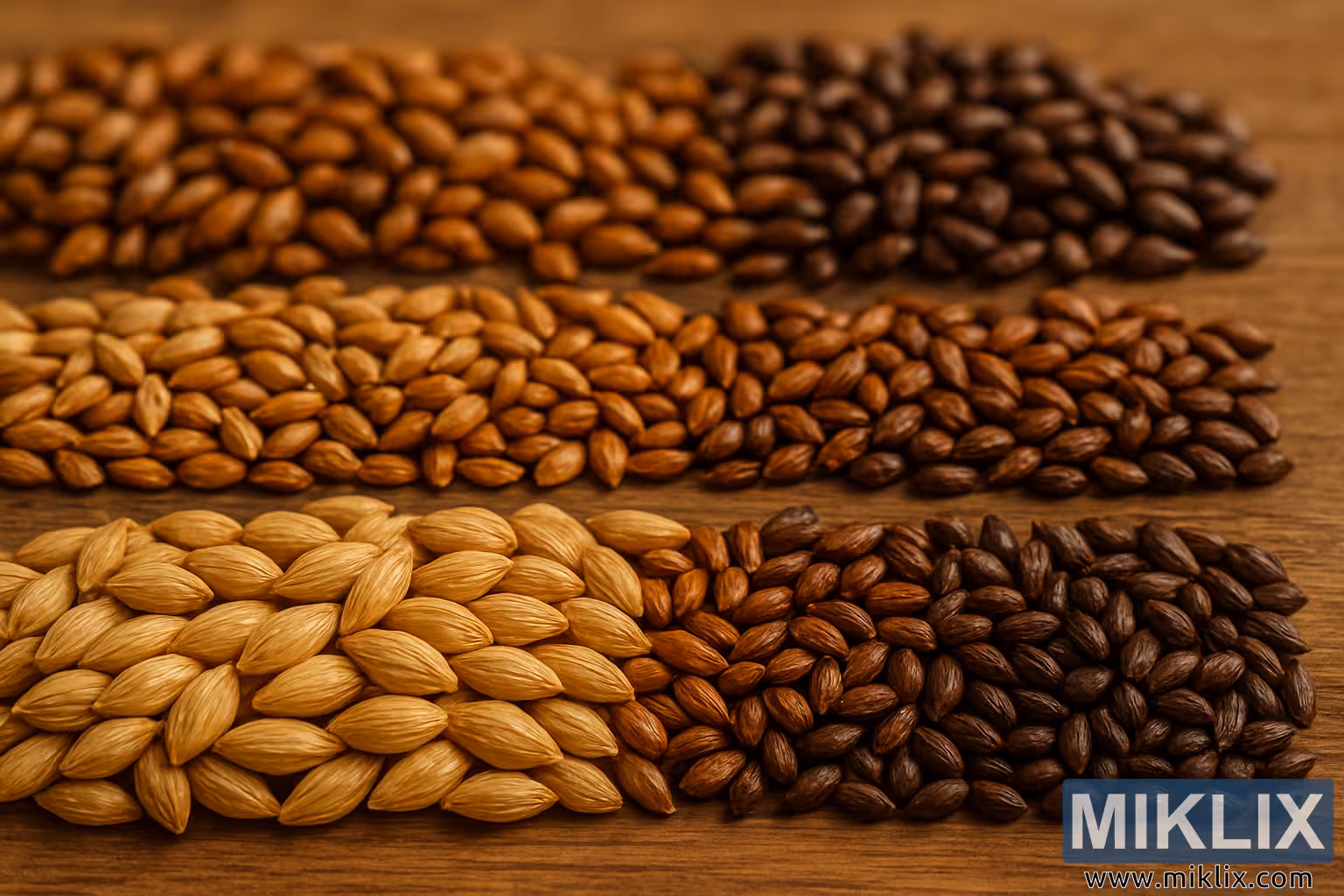 ကျေးသားသစ်သားမျက်နှာပြင်တစ်လျှောက် ပျံ့နှံ့သွားကာ၊ သပ်ရပ်စွာစီစဉ်ထားသော မုယောစပါးစေ့တန်းများသည် ရှုပ်ထွေးနက်နဲပြီး ချက်ခြင်းအနုပညာကို ပြောပြသည့် အရောင်အသွေးနှင့် အသွင်အပြင်ကို ပုံဖော်ထားသည်။ ဤအနီးကပ်ဖွဲ့စည်းမှုသည် အမြင်လေ့လာမှုတစ်ခုထက်ပိုသည်—၎င်းသည် စပါးတစ်စေ့စီမှ ပြုတ်ခြင်းနှင့် ကင်ခြင်းလုပ်ငန်းစဉ်တွင် ကွဲပြားသောအဆင့်ကိုကိုယ်စားပြုသည့် အသွင်ပြောင်းခြင်းဆိုင်ရာ ထိတွေ့မှုဇာတ်ကြောင်းတစ်ခုဖြစ်သည်။ အလင်းရောင်သည် ပျော့ပျောင်းပြီး နွေးထွေးကာ ကောက်နှံများ၏ အသွင်အပြင်နှင့် ၎င်းတို့၏ စပါးခွံ၏ သိမ်မွေ့သော တောက်ပမှုကို ပေါ်လွင်စေသည့် နူးညံ့သော အရိပ်များကို ပုံဖော်ထားသည်။ အလင်းနှင့် အရိပ်၏ ပေါင်းစပ်မှုက အခြေခံ malt များ၏ ရွှေဖျော့ဖျော့မှ အရောင်အသွေး ကြွယ်ဝသော ချောကလက်အညိုရောင်အထိ ပြင်းထန်စွာ ကင်ထားသော အထူးမျိုးကွဲများ၏ နက်နဲသော ချောကလက်အညိုရောင်များအထိ ဖြစ်သည်။