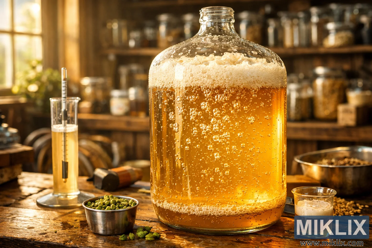 နေရောင်အောက်ရှိ သက်တောင့်သက်သာရှိသော အလုပ်ရုံတစ်ခုတွင် ရွှေရောင်အရည်၊ မြင့်တက်လာသော ပူဖောင်းများနှင့် ဂန္ထဝင်ဘီယာချက်လုပ်သည့်ကိရိယာများဖြင့် ပြည့်နေသော ဖန်ခွက်အိုးတစ်လုံးကို ပြသထားသည့် ဘီယာအချဉ်ဖောက်ခြင်း၏ အသေးစိတ်၊ လေထုဆန်သော ပုံတစ်ပုံ။