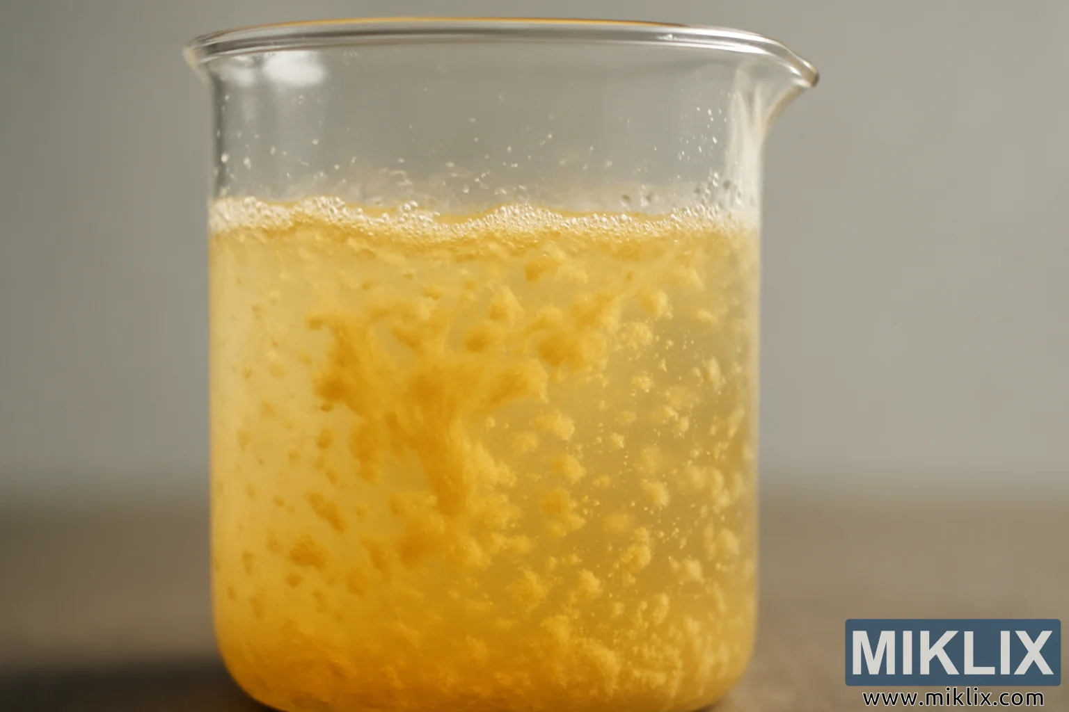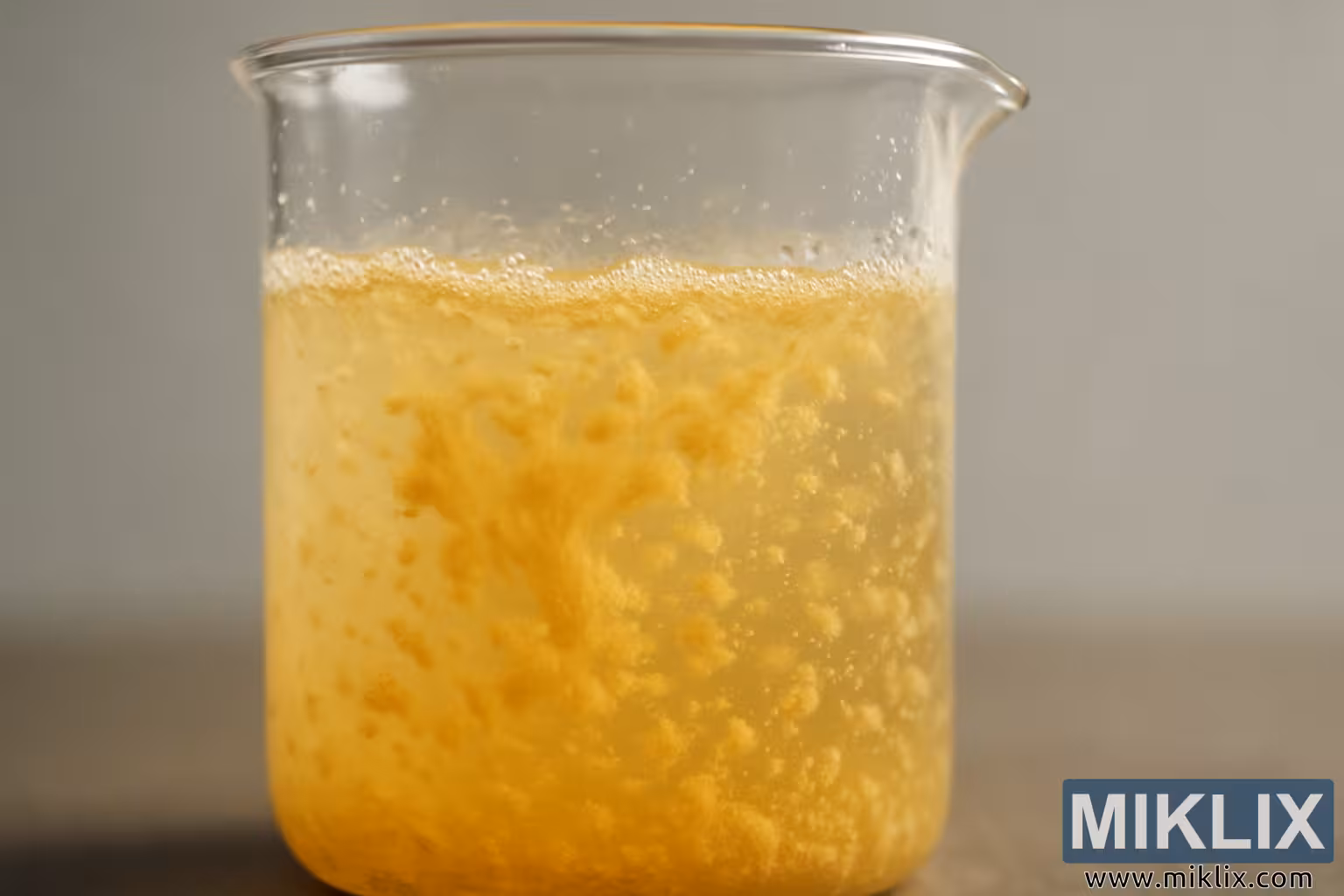 ရုပ်ပုံ- Glass Beaker ထဲတွင် Golden Flocculating Liquid ၏ အနီးကပ်မြင်ကွင်း