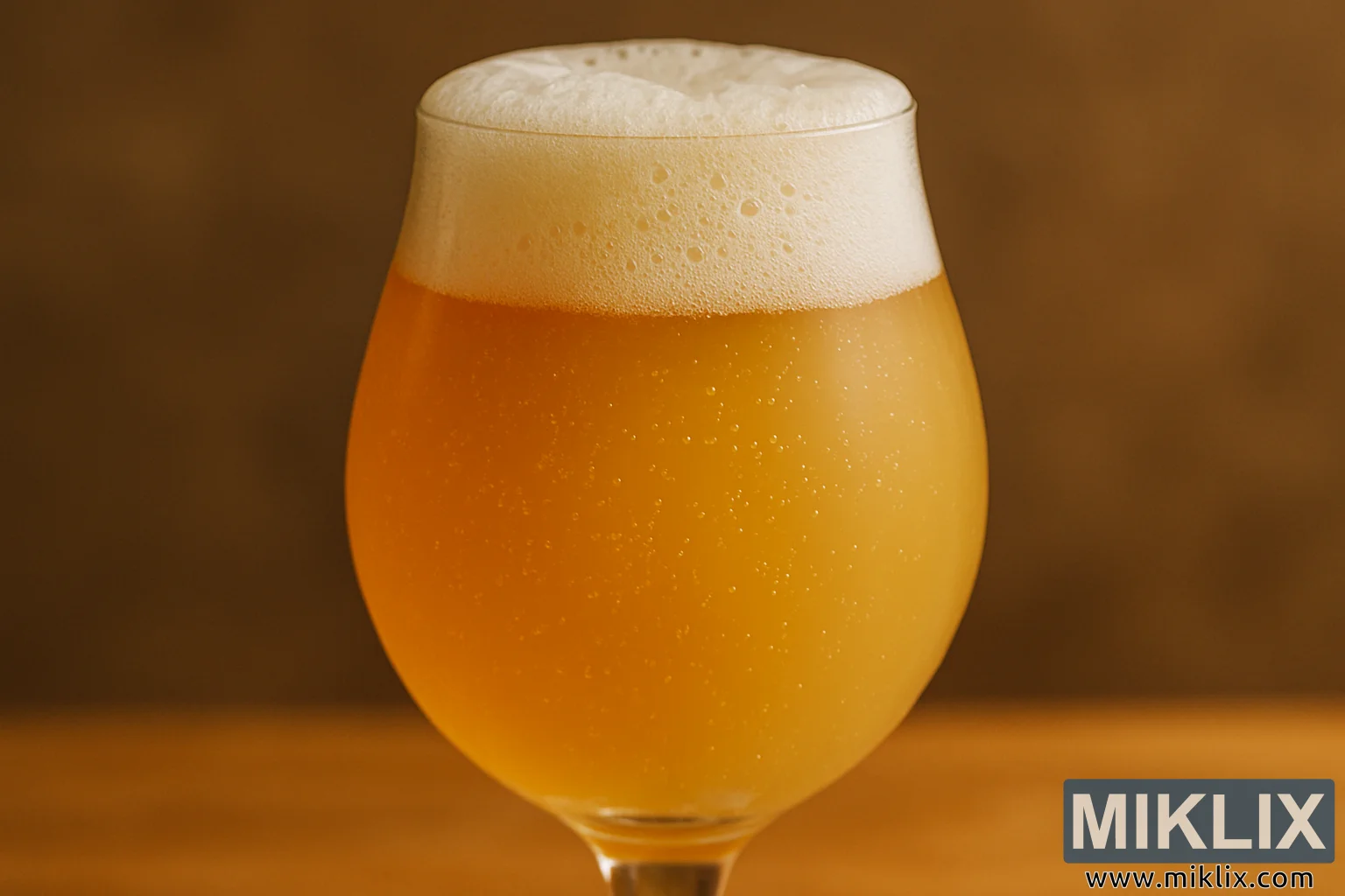 ဤလှပသောဓာတ်ပုံသည် tulip ပုံသဏ္ဌာန် ဘီယာဖန်ခွက်ဖြင့် လတ်ဆတ်သော သွန်းလောင်းထားသော Farmhouse Ale ၏ ဆိတ်ငြိမ်သောအလှနှင့် ရှုပ်ထွေးမှုကို ဖမ်းယူထားသည်။ ပါဝင်မှုကို တင်းတင်းကြပ်ကြပ် ဘောင်ခတ်ထားပြီး၊ ဖန်၏အကြောင်းအရာများအပေါ် ကြည့်ရှုသူ၏အာရုံစူးစိုက်မှုကို အာရုံစိုက်စေသည့် အနီးကပ်မြင်ကွင်းကို ပေးဆောင်သည် — မှုန်ဝါးသော ရွှေရောင်ပယင်းအရည်၊ ပူနွေးသောလေသံနှင့် နူးညံ့သောအသွင်အပြင်တို့ဖြင့် ပြည့်နှက်နေသည်။ ရိုးရာဓလေ့ထုံးတမ်းစဉ်လာတွင် အမြစ်တွယ်နေသည့် ဘီယာစတိုင်ကို မျှော်လင့်ခြင်းနှင့် ကြည်ညိုလေးစားမှုအပြည့်ဖြင့် အချိန်အတွင်း အေးခဲသွားပါသည်။