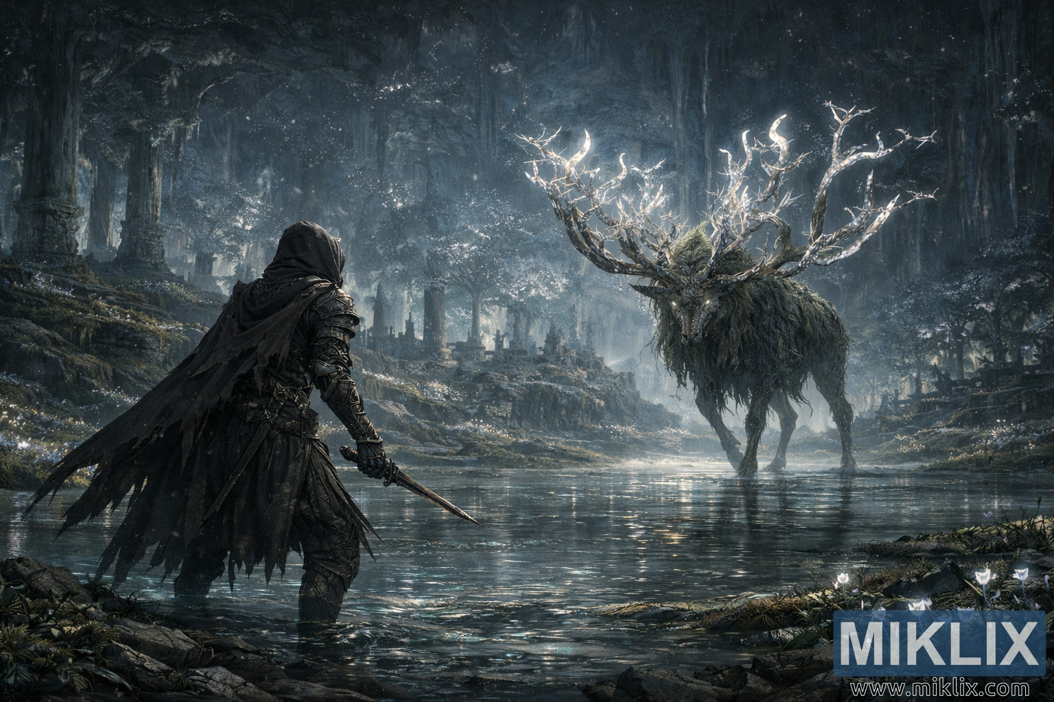 Siofra Hallowhorn Grounds ရဲ့ ရေလွှမ်းမိုးခံရတဲ့ အပျက်အစီးတွေထဲမှာ Tarnished နဲ့ luminous Ancestor Spirit တို့ကြားက လက်တွေ့ရင်ဆိုင်မှုကို ပြသထားတဲ့ Moody Elden Ring ပရိသတ်အနုပညာ။