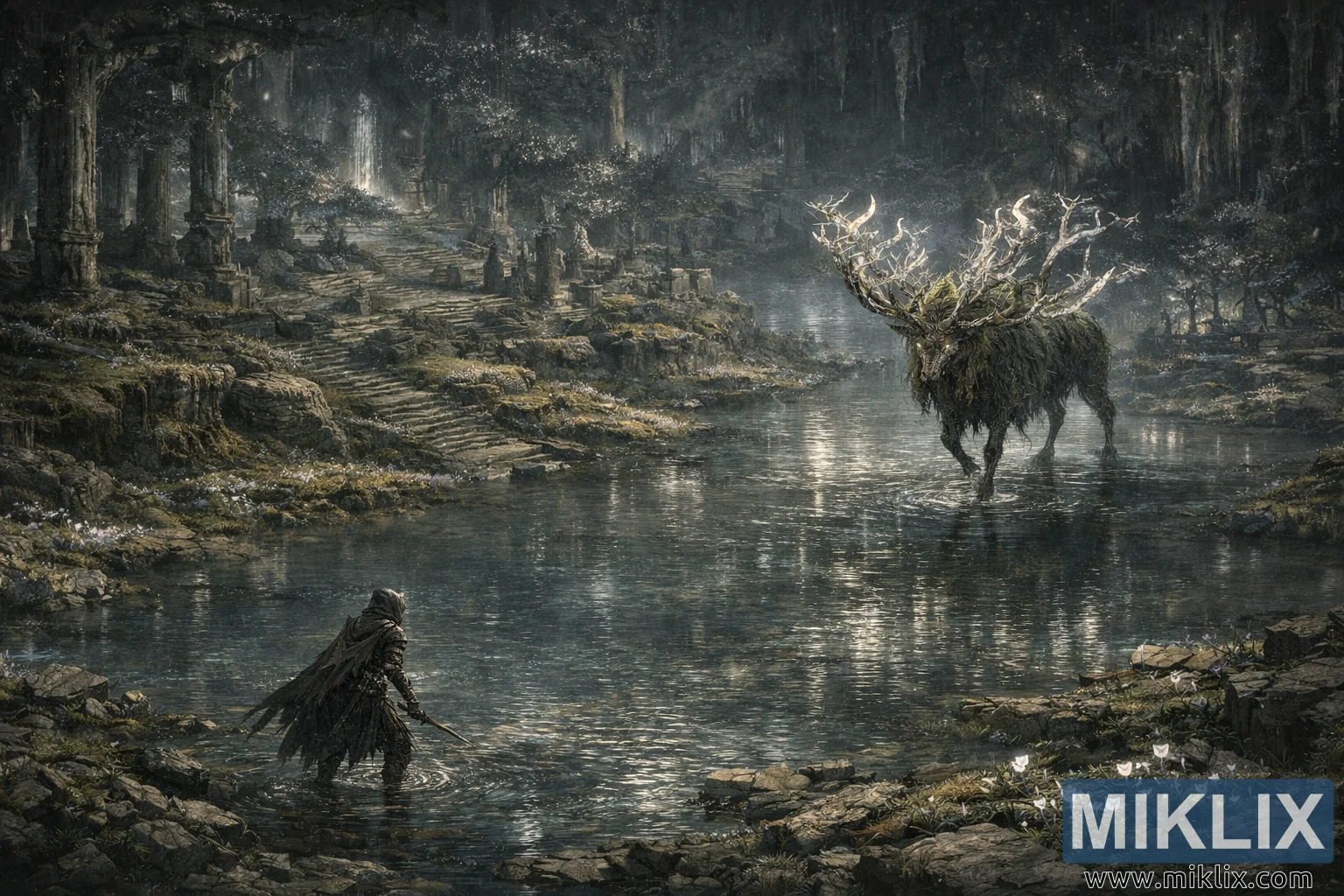 ဤပုံသည် Siofra Hallowhorn Grounds ၏ အပြည့်အစုံကို ဖော်ပြသည့် မြင့်မားသော isometric ရှုထောင့်ကို အသုံးပြုထားပြီး Tarnished နှင့် Ancestor Spirit အကြား ထိပ်တိုက်ရင်ဆိုင်မှုကို ရေနစ်မြုပ်နေသော မြေအောက်အပျက်အစီးတစ်ခုအတွင်း တည်ရှိသော လေးနက်သော ရုပ်ပုံလွှာတစ်ခုအဖြစ်သို့ ပြောင်းလဲပေးသည်။ ကြည့်ရှုသူသည် ကျိုးပဲ့နေသော ကျောက်စရစ်လှေကားထစ်များနှင့် ရှေးဟောင်းလှေကားများကို ဖြတ်၍ ဖောက်ထွင်းထားသော ရေတိမ်ကန်ကျယ်ကြီးကို ငုံ့ကြည့်သည်။ ထိုရေကန်အားလုံးကို ရေညှိများ၊ ဖျော့ဖျော့ပန်းများနှင့် ဇီဝအလင်းတန်းများဖြင့် နူးညံ့စေသည်။ အရောင်ပေါင်းစပ်မှုသည် တည်ငြိမ်ပြီး သဘာဝဆန်ပြီး မီးခိုးရောင်အေးများ၊ အစိမ်းရောင်ဖျော့ဖျော့များနှင့် ရေမျက်နှာပြင်မှ ညင်သာစွာ ထင်ဟပ်နေသော ငွေရောင်-အပြာရောင် အလင်းတန်းများဖြင့် လွှမ်းမိုးထားသည်။