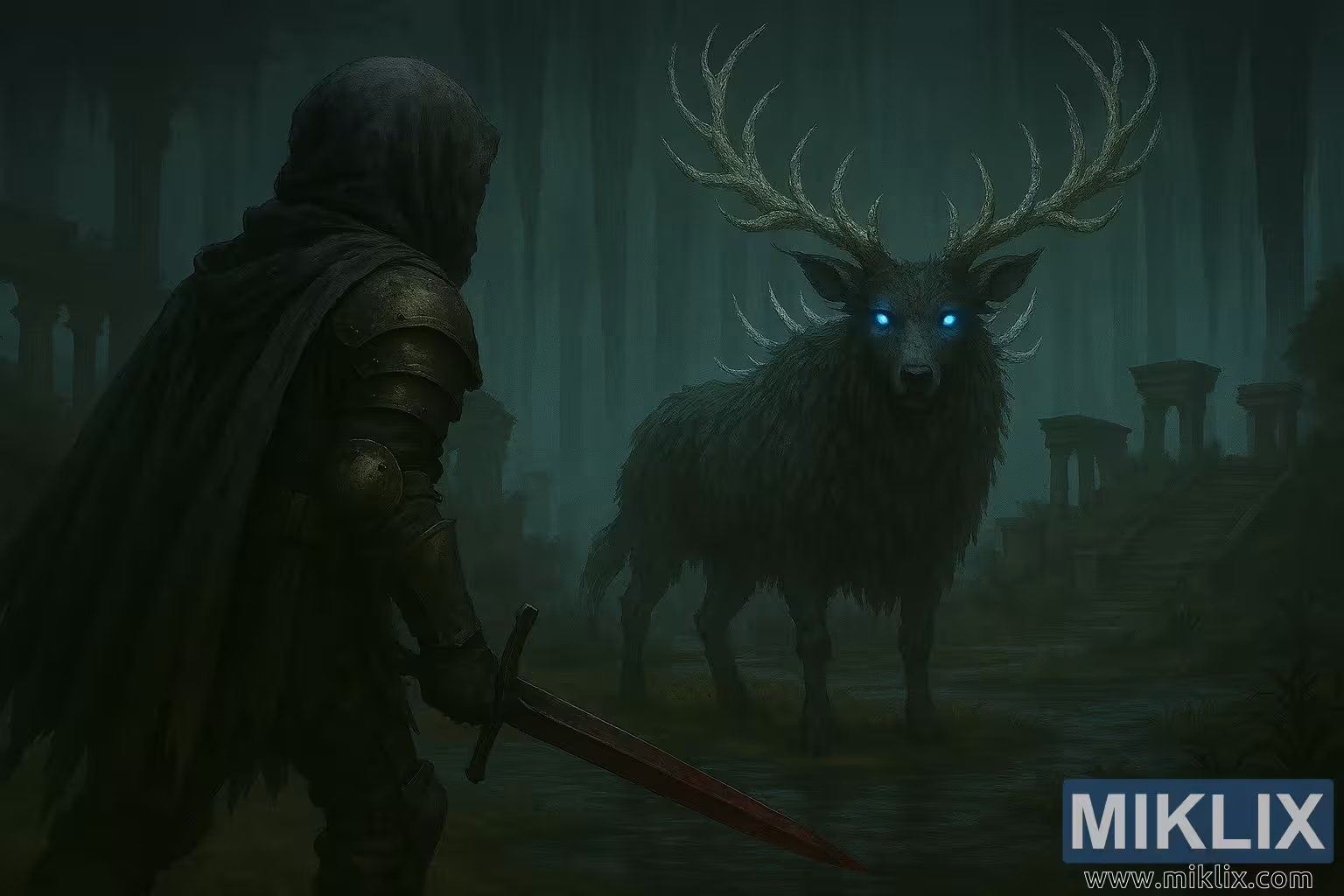 တိုက်ပွဲမတိုင်မီ ခဏအလို Siofra Hallowhorn Grounds ရှိ Tarnished နှင့် Ancestor Spirit တို့၏ မှောင်မိုက်သော စိတ်ကူးယဉ် ပရိသတ်အနုပညာ။