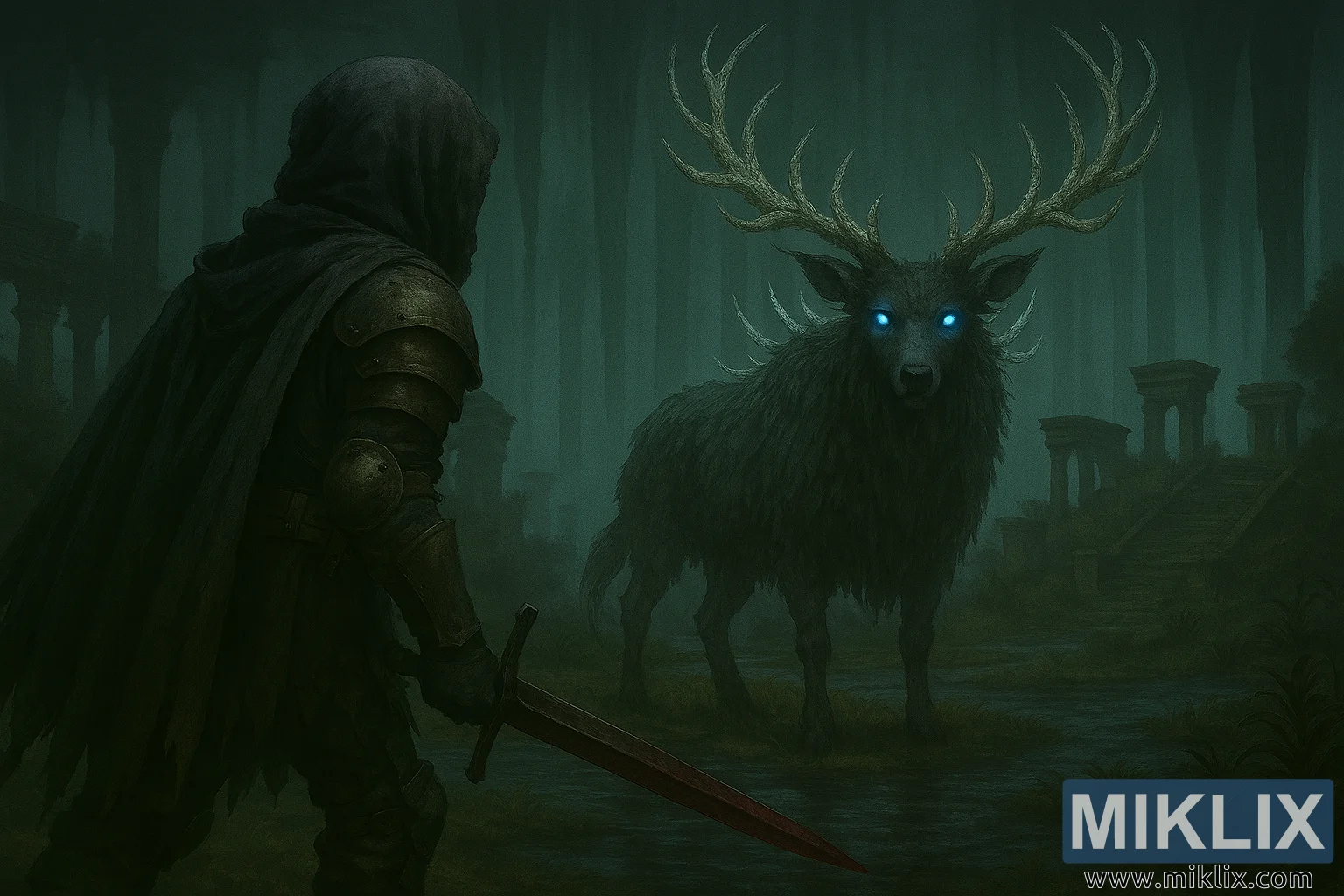 လျှို့ဝှက်ဆန်းကြယ်မှုများ ပြည့်နှက်နေသော လိုဏ်ဂူကြီးတစ်ခု၏ နောက်ခံမြင်ကွင်း။ တွဲလောင်းကျနေသော နွယ်ပင်များနှင့် ကျောက်စက်ပန်းဆွဲများကဲ့သို့သော ပုံသဏ္ဍာန်များပါရှိသော မြင့်မားသော သစ်ပင်များသည် အထက်ရှိ မြူခိုးများကြားတွင် ဆန့်တန်းနေသည်။ သစ်တောကြမ်းပြင်ကို ရေညှိများ၊ မြက်များနှင့် ရေကန်ငယ်များဖြင့် ဖုံးလွှမ်းထားပြီး ထိုရေကန်ငယ်များသည် သတ္တဝါ၏ ဦးချိုမှ မှိန်ပျပျအလင်းရောင်ကို ထင်ဟပ်စေသည်။ ရှေးဟောင်းကျောက်တုံးအပျက်အစီးများ—တိုင်များ၊ လှေကားများနှင့် ပလက်ဖောင်းများ—သည် မြူခိုးများကြားမှ ပေါ်ထွက်လာပြီး ပျောက်ဆုံးနေသော ယဉ်ကျေးမှုတစ်ခုကို ညွှန်ပြနေသည်။ နောက်ခံသည် နူးညံ့သော မြူခိုးများအဖြစ် ပျောက်ကွယ်သွားပြီး မြင်ကွင်း၏ အနက်နှင့် လေထုကို ပိုမိုကောင်းမွန်စေသည်။