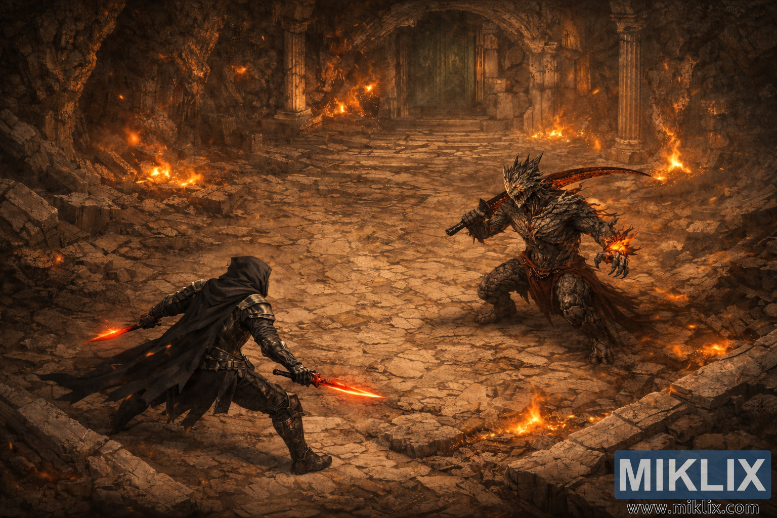 Isometric dark fantasy အနုပညာလက်ရာသည် Tarnished သည် Dragon's Pit ၏ မီးလျှံများကြားတွင် အလားတူအရွယ်အစားရှိသော ရှေးဟောင်းနဂါးလူသားနှင့် ယှဉ်ပြိုင်နေသည်ကို သရုပ်ဖော်ထားသည်။