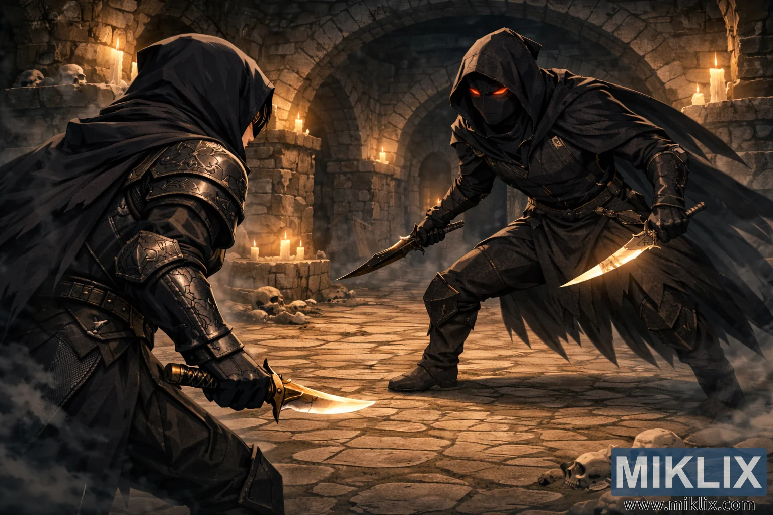 မှောင်မိုက်နေသော မြေအောက် catacomb စင်္ကြံတစ်ခုအတွင်း Tarnished နှင့် မြင့်မားသော Black Knife Assassin အကြား တိုက်ပွဲမတိုင်မီ တင်းမာမှုကို ပြသသည့် high-resolution anime fan art။