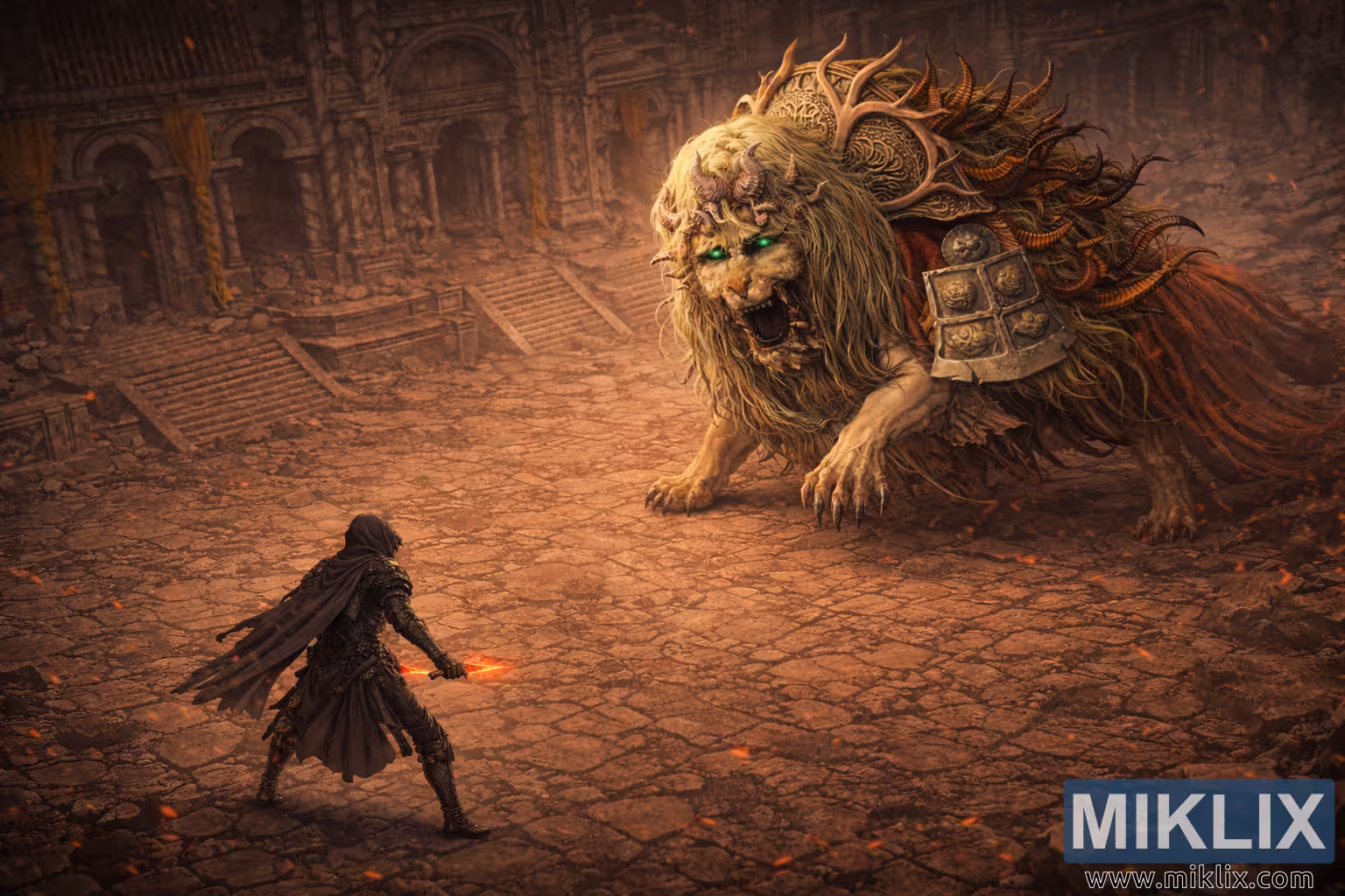 သူ့တစ်ဖက်တစ်ချက်မှာ ခြံဝင်းရဲ့ ညာဘက်ခြမ်းကို လွှမ်းမိုးထားတဲ့ နတ်သားရဲက ကခုန်နေတဲ့ ခြင်္သေ့ကြီးကို အလွန်ကြီးမားတဲ့ စကေးနဲ့ မတ်မတ်ရပ်ထားပါတယ်။ သူ့ရဲ့ ကြီးမားတဲ့ပုံသဏ္ဌာန်က Tarnished ထက် ပိုသေးသွယ်ပြီး နှိုင်းယှဉ်ကြည့်ရင် သူရဲကောင်းကို အားနည်းတဲ့ပုံပေါက်စေပါတယ်။ သားရဲရဲ့ ရှုပ်ထွေးနေတဲ့ ဖျော့ဖျော့ရွှေရောင်ဆံပင်က သူ့ရဲ့ပခုံးတွေနဲ့ သံချပ်ကာဘေးနှစ်ဖက်ကို ဖုံးလွှမ်းနေပြီး ကောက်ကွေးနေတဲ့ ဦးချိုတွေနဲ့ ဦးချိုလို အဖုအထစ်တွေက သူ့ရဲ့ဦးခေါင်းခွံနဲ့ ကျောကနေ ပျက်စီးနေတဲ့ သရဖူလို ပေါက်ထွက်လာပါတယ်။ သူ့ရဲ့မျက်လုံးတွေက ထူးဆန်းတဲ့အစိမ်းရောင်တောက်လောင်နေပြီး မေးရိုးတွေက ဟိန်းဟောက်သံနဲ့အတူ ပွင့်ဟနေပြီး ချွန်ထက်တဲ့သွားတွေကို ပေါ်လွင်စေပါတယ်။ ကြီးမားတဲ့ ခြေသည်းကြီးတစ်ခုက ကျောက်ကြမ်းပြင်ကို မှီထားပြီး အက်ကွဲနေတဲ့ ကြွေပြားတွေကို ကြေမွစေပြီး ဘေးတစ်ဖက်မှာ တပ်ဆင်ထားတဲ့ လေးလံတဲ့ အခမ်းအနားသံချပ်ကာတွေက မေ့လျော့ခံထားရတဲ့ ထုံးတမ်းစဉ်လာတွေရဲ့ ထွင်းထုထားတဲ့ သင်္ကေတတွေနဲ့ မှိုင်းညို့ညို့တောက်ပနေပါတယ်။