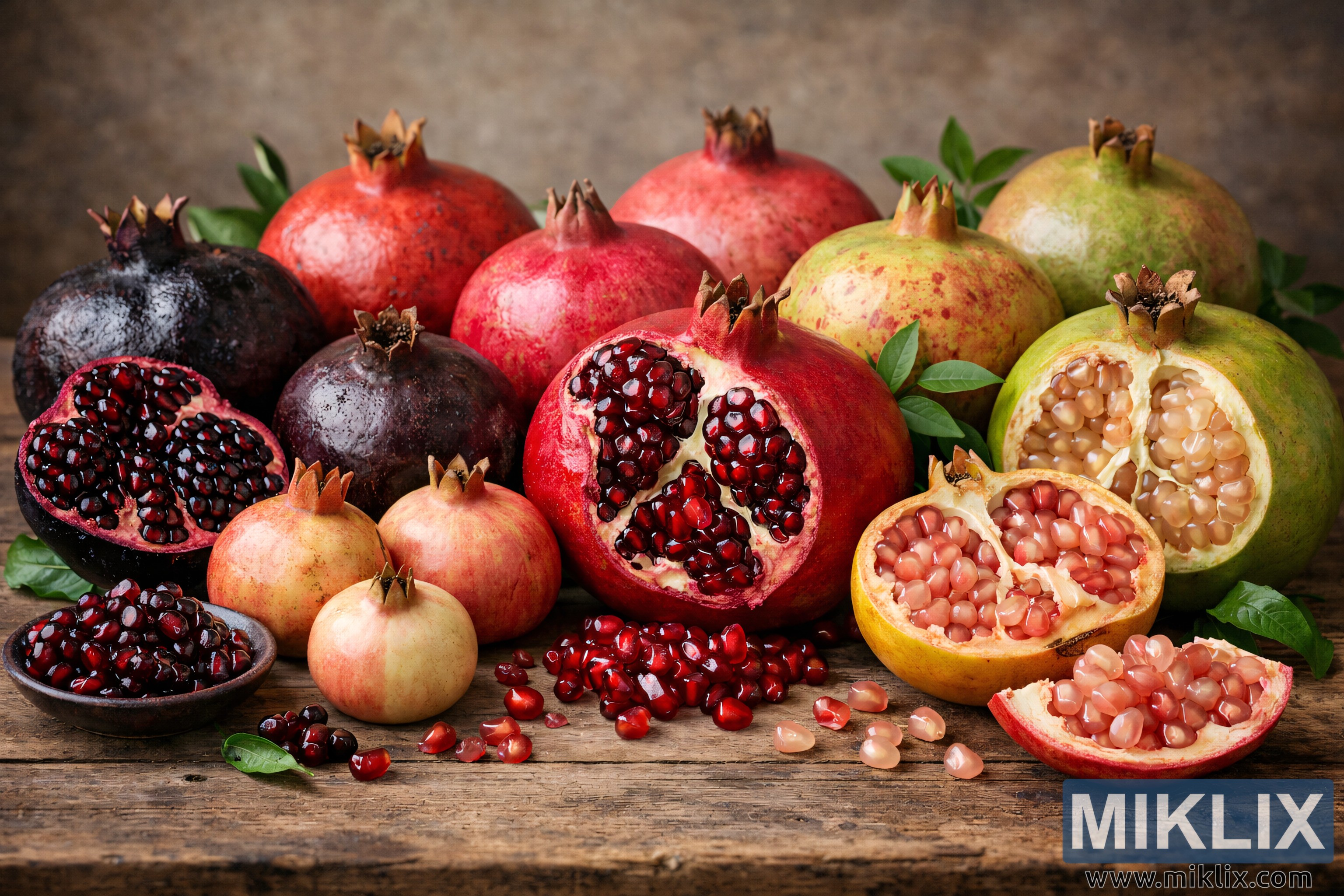 ပုံတွင် ရိုးရာသစ်သားစားပွဲခုံပေါ်တွင် စီစဉ်ထားသော သလဲသီးအမျိုးအစားအမျိုးမျိုးကို ကြွယ်ဝစွာအသေးစိတ်ဖော်ပြထားပြီး ရှုခင်းကိုအခြေခံသည့် တည်ငြိမ်သောဓာတ်ပုံကို တင်ပြထားသည်။ ဖွဲ့စည်းမှုတွင် အရွယ်အစား၊ အရောင်၊ အသားနှင့် မှည့်မှုတို့တွင် ကွဲပြားမှုကို အလေးပေးဖော်ပြထားပြီး အသီး၏သဘာဝကွဲပြားမှုကို မြင်သာအောင်ကြည့်ရှုနိုင်စေပါသည်။ သလဲသီးတစ်လုံးလုံးကို ထက်ခြမ်းခြမ်းထားသောနှင့် တစ်စိတ်တစ်ပိုင်းပွင့်နေသော အသီးများနှင့် ရောနှောထားခြင်းကြောင့် အတွင်းပိုင်းရှိ အခွံများကို ရှင်းရှင်းလင်းလင်းမြင်နိုင်စေပါသည်။ အပြင်ဘက်အခွံများသည် ရင့်မှည့်သောဘာဂန်ဒီရောင်နှင့် မှောင်သောကြက်သွေးရောင်မှ တောက်ပသောအနီရောင်၊ ပန်းရောင်၊ အဝါဖျော့ဖျော့နှင့် ရွှေရောင်အစိမ်းရင့်ရောင်အထိ အမျိုးမျိုးရှိပြီး အချို့တွင် ကွဲပြားသောမျိုးကွဲများနှင့် ရင့်မှည့်မှုအဆင့်များကို ညွှန်ပြသည့် အစက်အပြောက်များနှင့် အစက်အပြောက်များပါရှိသည်။ အသီးများ၏ထိပ်ရှိ အခွံများသည် မပျက်မစီးဘဲ ပုံသဏ္ဍာန်အမျိုးမျိုးရှိပြီး ပန်းပုလက်ရာအသေးစိတ်ကို ထည့်သွင်းထားသည်။ လှီးထားသော သလဲသီးအများအပြားသည် ကြည်လင်သောအနီရောင်နှင့် နူးညံ့သောမက်မွန်သီးမှ တောက်ပသောပတ္တမြားနီရောင်အထိ အရောင်အမျိုးမျိုးရှိသော ကျစ်လစ်သိပ်သည်းသော အခွံများကို ပေါ်လွင်စေပြီး အလင်းရောင်ကိုဖမ်းယူကာ အရည်ရွှမ်းသော မျက်နှာပြင်များဖြင့် တောက်ပသောမျက်နှာပြင်များရှိသည်။ စားပွဲပေါ်တွင် အခွံလွတ်များကို သေးငယ်သောအစုအဝေးများအဖြစ် ပြန့်ကျဲထားပြီး ပေါများမှုနှင့် သဘာဝမစုံလင်မှုကို ပိုမိုအားကောင်းစေသည်။ လတ်ဆတ်သောအစိမ်းရောင်အရွက်များကို အသီးများကြားတွင် ထားရှိခြင်းဖြင့် အရောင်နှင့်ပုံသဏ္ဍာန်တွင် ဆန့်ကျင်ဘက်ဖြစ်စေပြီး ဖွဲ့စည်းမှုကို လွှမ်းမိုးမှုမရှိဘဲ ဘောင်ခတ်ပေးသည်။ နောက်ခံသည် ညင်သာစွာ မှုန်ဝါးပြီး ကြားနေအရောင်ဖြစ်ပြီး မြေကြီးရောင်နှင့် မီးခိုးရောင်များက အာရုံစူးစိုက်မှုကို သစ်သီးများအပေါ် အာရုံစိုက်စေပြီး နက်ရှိုင်းမှုနှင့် လေထုကို ပေါင်းထည့်ပေးသည်။ အလင်းရောင်သည် နူးညံ့ပြီး ဦးတည်ချက်ကျသောပုံပေါ်ပြီး အနည်းငယ်ကြမ်းတမ်းသော အခွံများ၊ ချောမွေ့သော ဖန်ကဲ့သို့ အစေ့များနှင့် အောက်ခံရှိ သစ်သားအိုများ၏ အစေ့အဆန်ကဲ့သို့သော အသွင်အပြင်များကို မီးမောင်းထိုးပြသည်။ အလုံးစုံခံစားချက်သည် နွေးထွေးပြီး သဘာဝကျကာ ဖိတ်ခေါ်မှုရှိပြီး ရိတ်သိမ်းမှု၊ မျိုးစုံမှုနှင့် လတ်ဆတ်မှုဆိုင်ရာ အဓိကအကြောင်းအရာများကို ပေါ်လွင်စေပြီး ပုံကို အယ်ဒီတာ၊ အစားအစာ၊ စိုက်ပျိုးရေး သို့မဟုတ် ပညာရေးဆိုင်ရာ အကြောင်းအရာများအတ