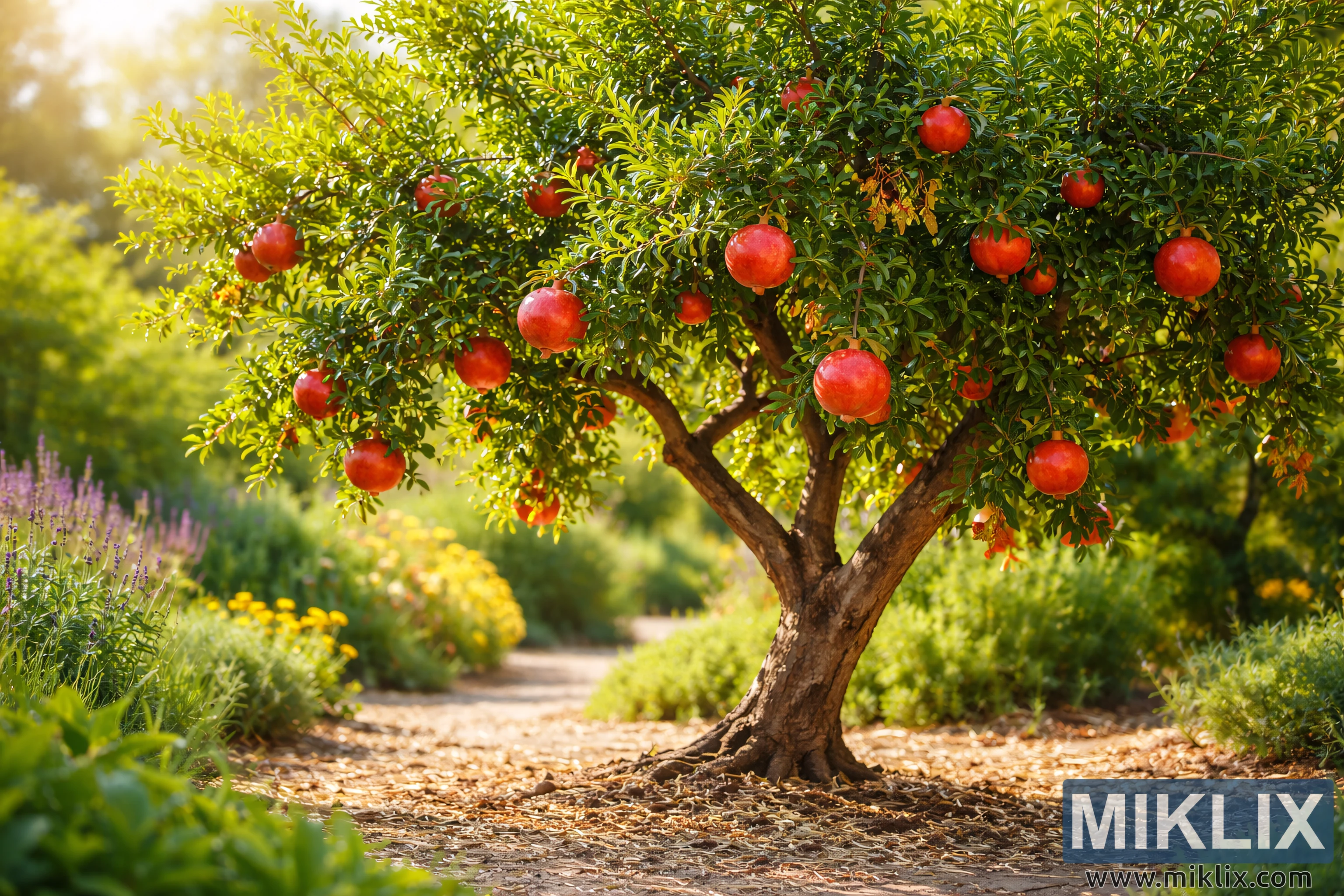 ပုံတွင် ရေစစ်ကောင်းသော မြေဆီလွှာတွင် ပေါက်ရောက်သော ရင့်ကျက်သော သလဲသီးပင်တစ်ပင်ကို ဗဟိုပြု၍ တိတ်ဆိတ်ငြိမ်သက်သော နေရောင်ခြည်အောက်တွင် ဥယျာဉ်မြင်ကွင်းကို တင်ပြထားသည်။ သစ်ပင်သည် အနည်းငယ်လိမ်ကောက်နေသော၊ ဖွဲ့စည်းပုံရှိသော ပင်စည်တစ်ခုဖြင့် ကျယ်ပြန့်ပြီး လုံးဝန်းသော အရိပ်အယောင်များအဖြစ် အပြင်ဘက်သို့ အကိုင်းအခက်များ ဖြာထွက်နေသည်။ ၎င်း၏ အခေါက်သည် ရာသီဥတုဒဏ်ခံနိုင်သော်လည်း ကျန်းမာသန်စွမ်းပုံရပြီး သဘာဝအပေါက်များနှင့် အလင်းရောင်ကို ဖမ်းယူသော နွေးထွေးသော အညိုရောင်များဖြင့် ရှိနေသည်။ သိပ်သည်းပြီး တောက်ပြောင်သော အစိမ်းရောင် အရွက်များသည် အကိုင်းအခက်များကို ဖြည့်ပေးပြီး နေရောင်ခြည်ကို မြေပြင်တစ်လျှောက် နူးညံ့ပြီး အစက်အပြောက်များအဖြစ် စစ်ထုတ်ပေးသည့် စိမ်းလန်းစိုပြေသော သရဖူကို ဖန်တီးပေးသည်။ ရင့်မှည့်နေသော သလဲသီးများစွာသည် အမြင့်အမျိုးမျိုးရှိ အကိုင်းအခက်များမှ ချိတ်ဆွဲထားပြီး ၎င်းတို့၏ ချောမွေ့ပြီး လုံးဝန်းသော ပုံသဏ္ဍာန်များသည် အနီရောင်နှင့် ကြက်သွေးရောင် အရိပ်များဖြင့် တောက်ပနေသည်။ အချို့သော သစ်သီးများသည် တိုက်ရိုက်နေရောင်ခြည်ဖြင့် ပေါ်လွင်စေပြီး ၎င်းတို့ကို တောက်ပြောင်ပြီး တောက်ပသော အသွင်အပြင်ကို ပေးစွမ်းပြီး အချို့မှာ တစ်စိတ်တစ်ပိုင်း အရိပ်တွင် ရှိနေကာ မြင်ကွင်းကို နက်ရှိုင်းမှုနှင့် ဆန့်ကျင်ဘက်ဖြစ်စေသည်။ သစ်ပင်ပတ်လည်ရှိ ဥယျာဉ်ပတ်ဝန်းကျင်သည် ဂရုတစိုက် ထိန်းသိမ်းထားသော်လည်း သဘာဝကျသည်ဟု ခံစားရပြီး ပင်စည်၏အောက်ခြေတွင် ပန်းပွင့်သော အပင်ငယ်များနှင့် မြက်ပင်များ ဝန်းရံထားသည်။ အဝါရောင်နှင့် ခရမ်းရောင် ပန်းပွင့်များသည် နောက်ခံတွင် ပြန့်ကျဲနေပြီး အနည်းငယ် မှုန်ဝါးနေပြီး အဓိက အကြောင်းအရာမှ အာရုံမပျံ့လွင့်ဘဲ သိမ်မွေ့သော အရောင်များကို ပေါ်လွင်စေသည်။ သစ်ပင်အောက်က မြေဆီလွှာဟာ ရေစစ်ကောင်းကောင်းရတဲ့ ဥယျာဉ်ခင်းနဲ့ လိုက်ဖက်ပြီး ခြောက်သွေ့ပြီး သဲဆန်တဲ့ပုံပေါက်ကာ ကြွေကျနေတဲ့ အရွက်တွေနဲ့ အော်ဂဲနစ် မြေဩဇာတွေနဲ့ ဖုံးအုပ်ထားပါတယ်။ သစ်ပင်နောက်မှာ ကျဉ်းမြောင်းတဲ့ ဥယျာဉ်လမ်းကြောင်းက ညင်သာစွာ ကွေးညွှတ်နေပြီး မြင်ကွင်းထဲကို ပိုမိုနက်ရှိုင်းစွာ လမ်းညွှန်ပေးပြီး ဖြည်းဖြည်းချင်း လမ်းလျှောက်ခြင်းနဲ့ တိတ်ဆိတ်ငြိမ်သက်စွာ ကြည့်ရှုခြင်းအတွက် ရည်ရွယ်တဲ့ ငြိမ်းချမ်းတဲ့နေရာတစ်ခုကို ညွှန်ပြနေပါတယ်။ မီးအလင်းရောင်က အသီးအနှံတွေ အပြည့်အဝ ကြီးထွားပြီး ရိတ်သိမ်းဖို့ အသင့်ဖြစ်နေတဲ့ နွေရာသီနှောင်းပိုင်း ဒါမှမဟုတ် ဆောင်းဦးရာသီအစောပိုင်းရဲ့ နွေးထွေးတဲ့ နေ့လယ်ခင်းကို ညွှန်ပြနေပါတယ်။ အပေါ်ဘယ်ဘက်ကနေ နေရောင်ခြည်က စိမ့်ဝင်လာပြီ