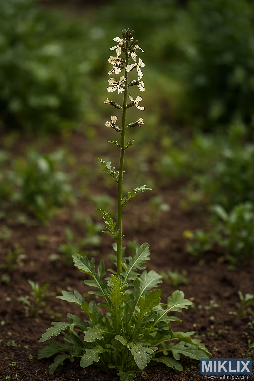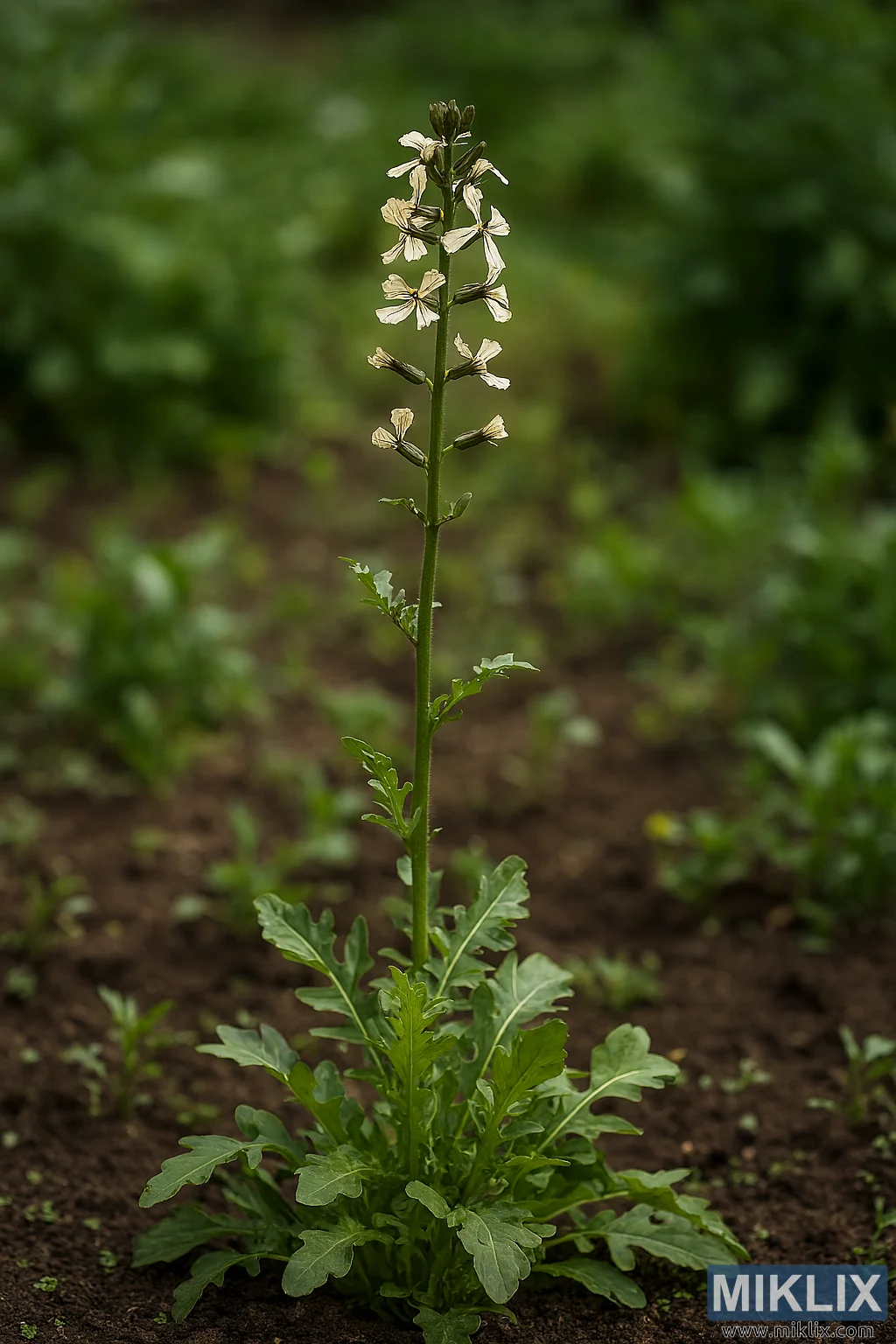 လက်တွေ့ဥယျာဉ်ပတ်ဝန်းကျင်တွင် ၎င်း၏ မြင့်မားသောပန်းပွင့်ပင်စည်နှင့် အဖျားပိုင်းအရွက်များကို ပြသထားသည့် arugula အပင်၏ အရည်အသွေးမြင့်ပုံ။