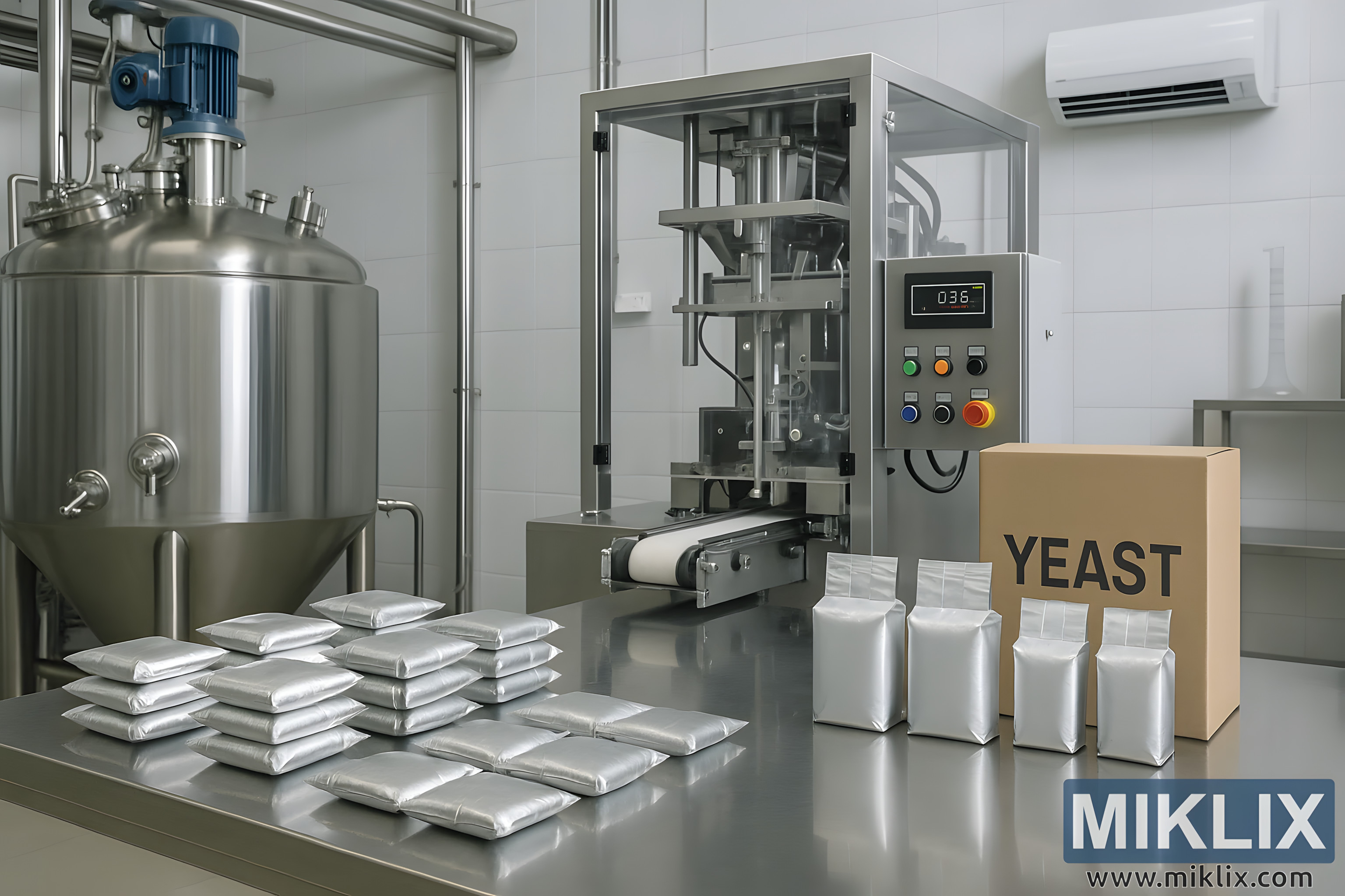 Midt på bakken til høyre står en stor automatisert pakkemaskin på arbeidsflaten, innkapslet i et gjennomsiktig beskyttende hus. Denne maskinen ser ut til å være en vertikal form-fyll-forseglingsenhet, utstyrt med et smalt transportbånd som strekker seg fra bunnen. Inne i det gjennomsiktige huset er mekaniske komponenter i rustfritt stål, pneumatiske aktuatorer og materør synlige, noe som antyder et system designet for å veie, fylle og forsegle gjærpakker presist i en kontinuerlig, automatisert prosess. Et digitalt kontrollpanel på forsiden viser en numerisk avlesning, sammen med flere opplyste knapper i rødt, grønt, blått og gult, som indikerer at maskinen er drevet og i drift. Maskinens rene, kantete overflater og kompakte form formidler effektivitet og teknisk raffinement.