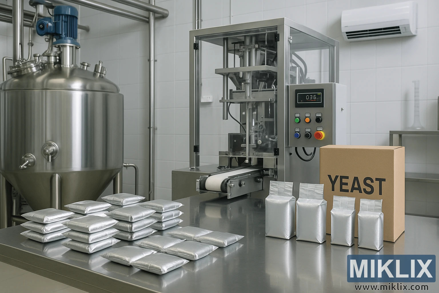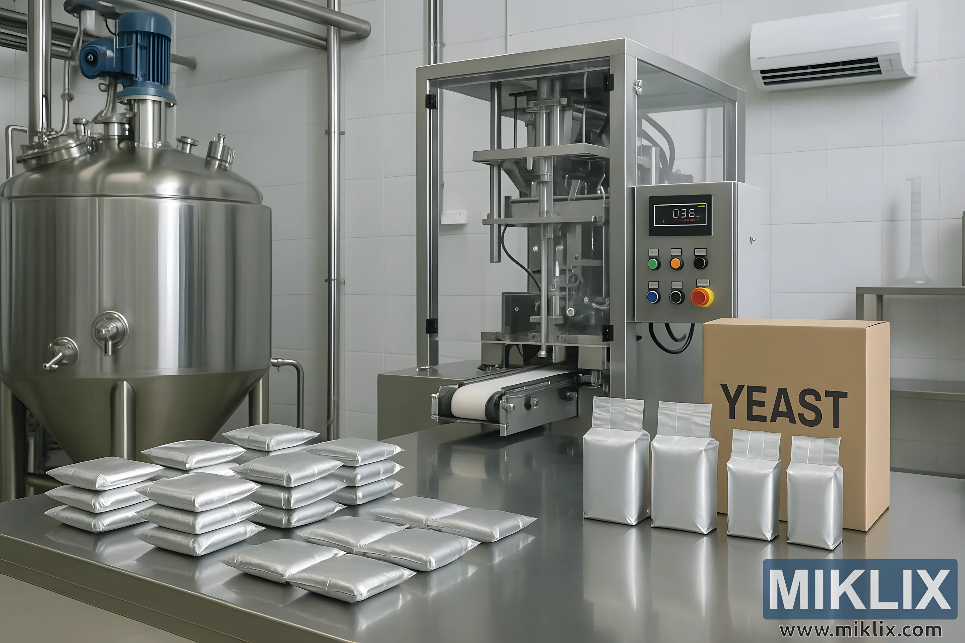 Et plettfritt gjærpakkeri viser frem forseglede foliepakker, en automatisert fyllemaskin og utstyr i rustfritt stål under sterk belysning.