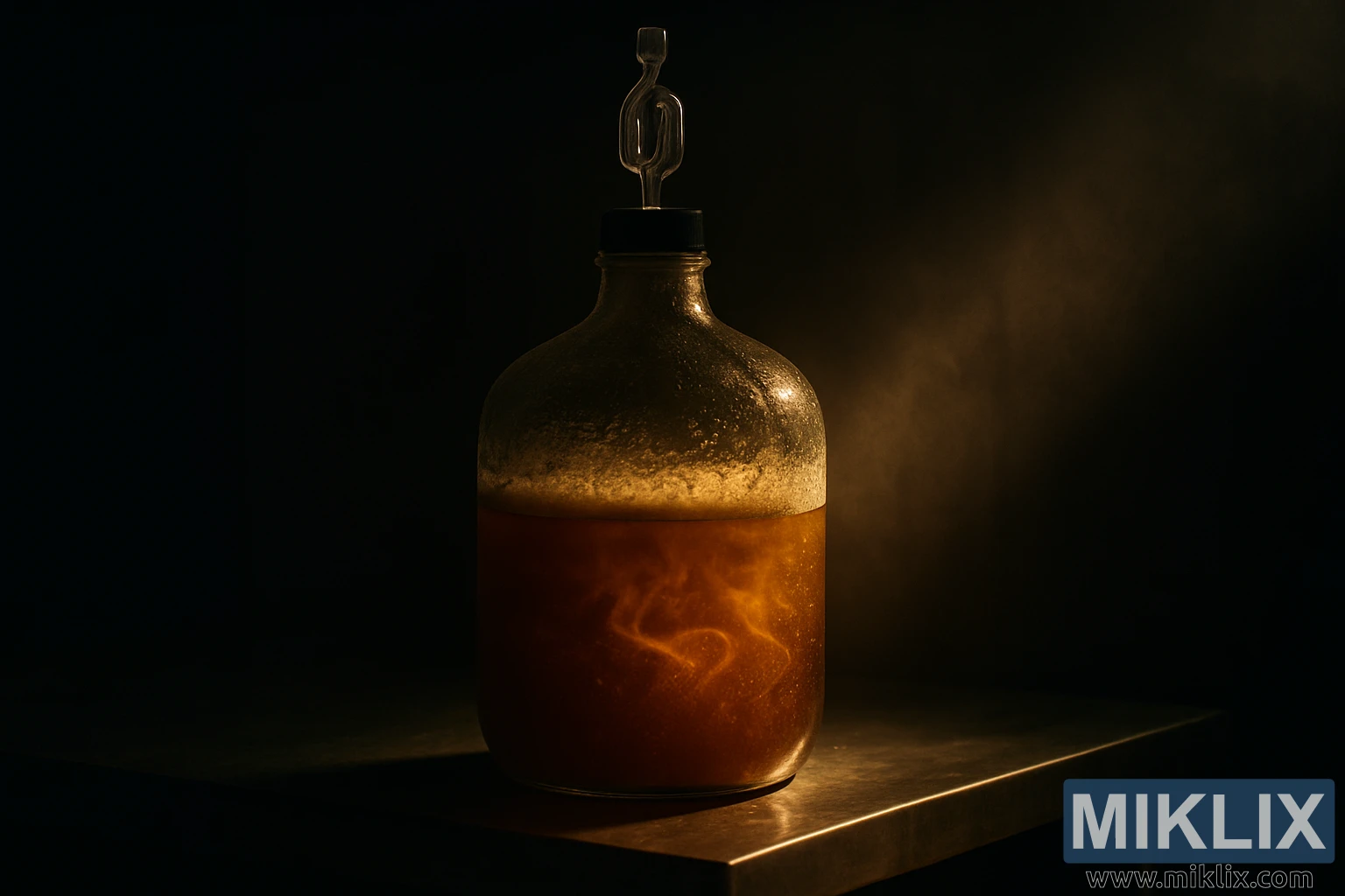 Glassdunken er bred ved bunnen og smalner forsiktig av mot halsen, som er forseglet av en svart gummipropp som holder en slank S-formet sluse. Slusen står oppreist, svakt silhuettert av et diskret gyllent bakgrunnsbelysning, og konturene kommer så vidt frem fra det omkringliggende mørket. Dunkens overflate er prikket med fine dråper av kondens, som fanger og bryter det varme lyset, og fremstår som små prikker av glans spredt over det skyggefulle glasset. Denne fuktigheten hinter til den kontrollerte temperaturen og fuktigheten i gjæringsrommet, noe som tyder på et nøye administrert bryggemiljø.