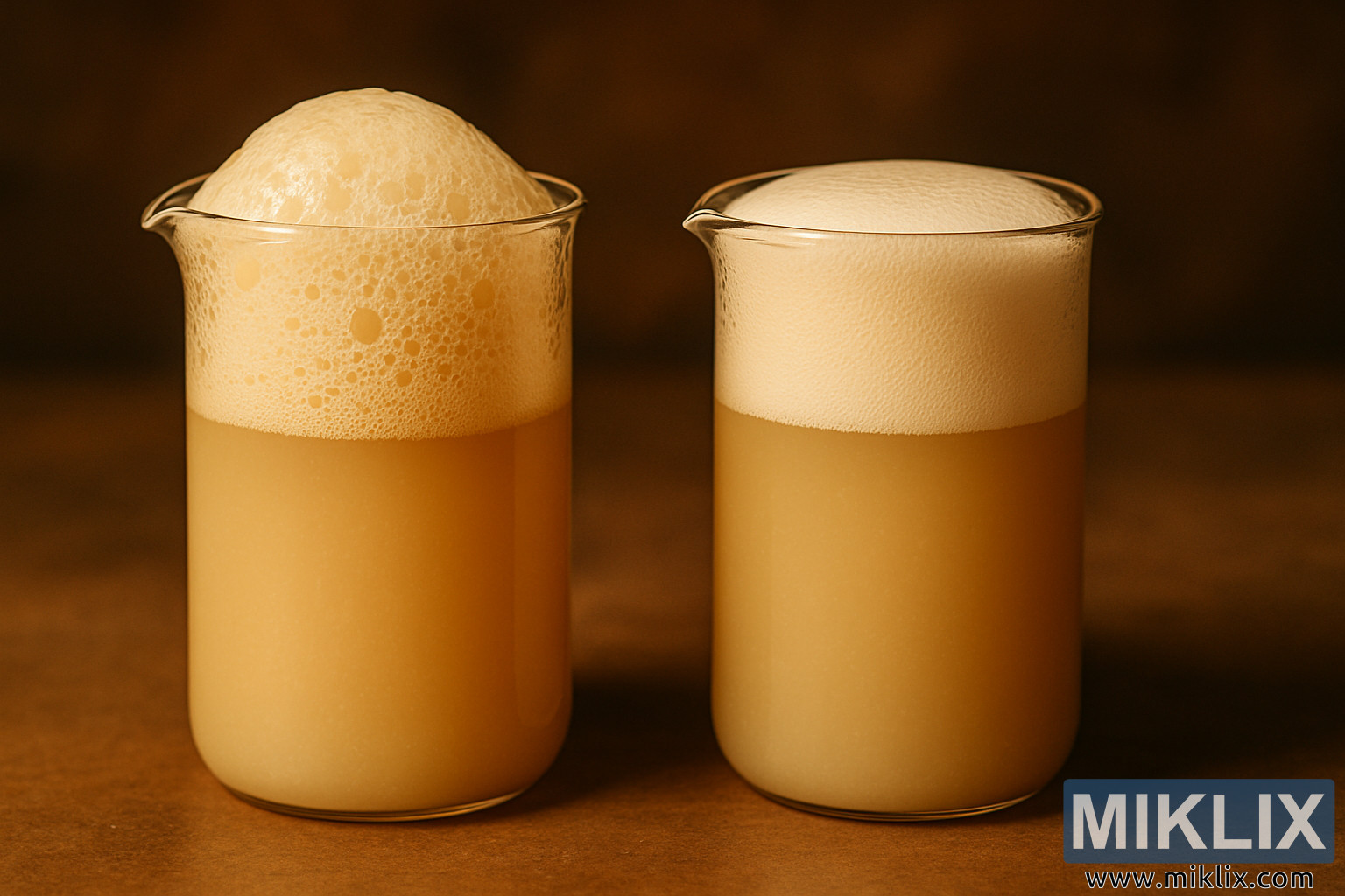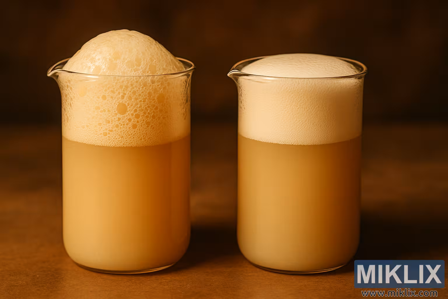 Bildet viser et varmt belyst nærbilde i høy oppløsning av to gjennomsiktige glassbegerglass plassert side om side på en glatt, ravfarget overflate. Begge begerglassene er fylt med ugjennomsiktige, beigefargede ølgjærsuspensjoner, men skummet på toppen av hvert beger skiller visuelt de to gjærstammene fra hverandre.
