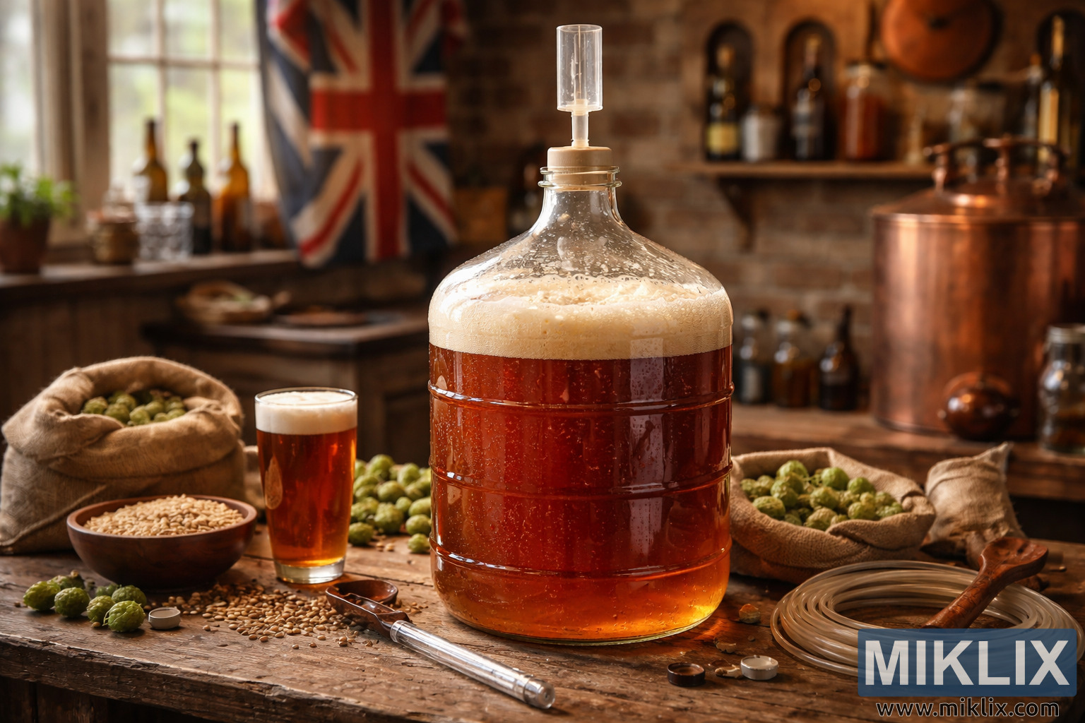 Høyoppløselig bilde av britisk øl som gjærer i en glassdunk på et trebord, omgitt av humle og bryggeverktøy i et rustikt britisk hjemmebryggingsmiljø.