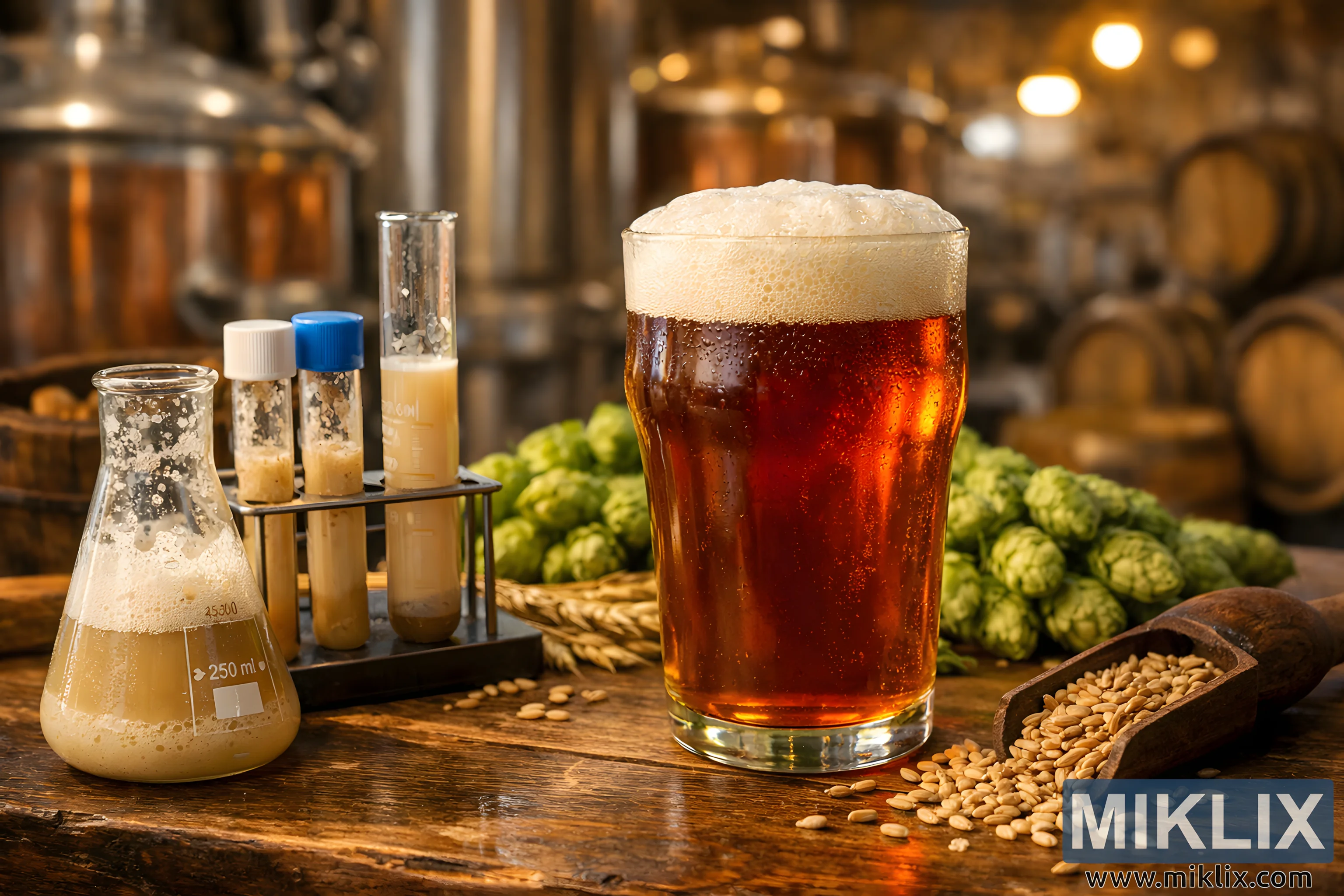 Glasset hviler på et godt slitt bryggebord i tre, der årer, riper og ufullkommenheter forteller en historie om lang bruk og håndverk. I forgrunnen, nøye arrangert ved siden av ølet, står et utvalg av vitenskapelige glassvarer knyttet til gjæring. En liten erlenmeyerkolbe og flere oppreiste reagensrør er delvis fylt med uklare, beige gjærkulturer. Gjæren virker aktiv og levende, noe som hinter til pågående gjæring og eksperimentering. Målemarkeringer på glasset forsterker den vitenskapelige presisjonen bak bryggingen, og står i vakker kontrast til det rustikke treverket under.