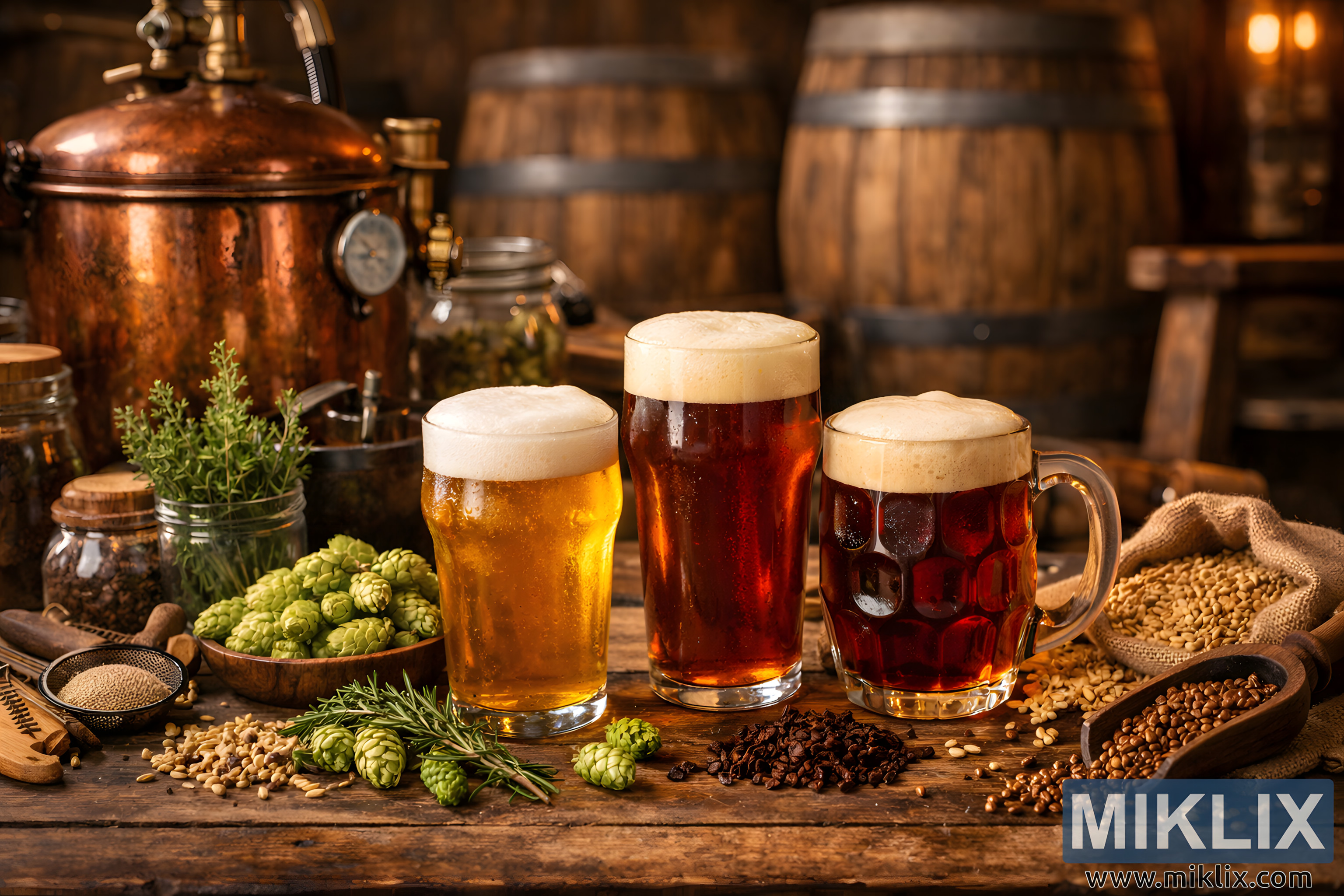 Et varmt, rustikt bryggeribilde med britisk øl, fersk humle, maltkorn, urter og kobberbryggeutstyr i koselige publignende omgivelser.