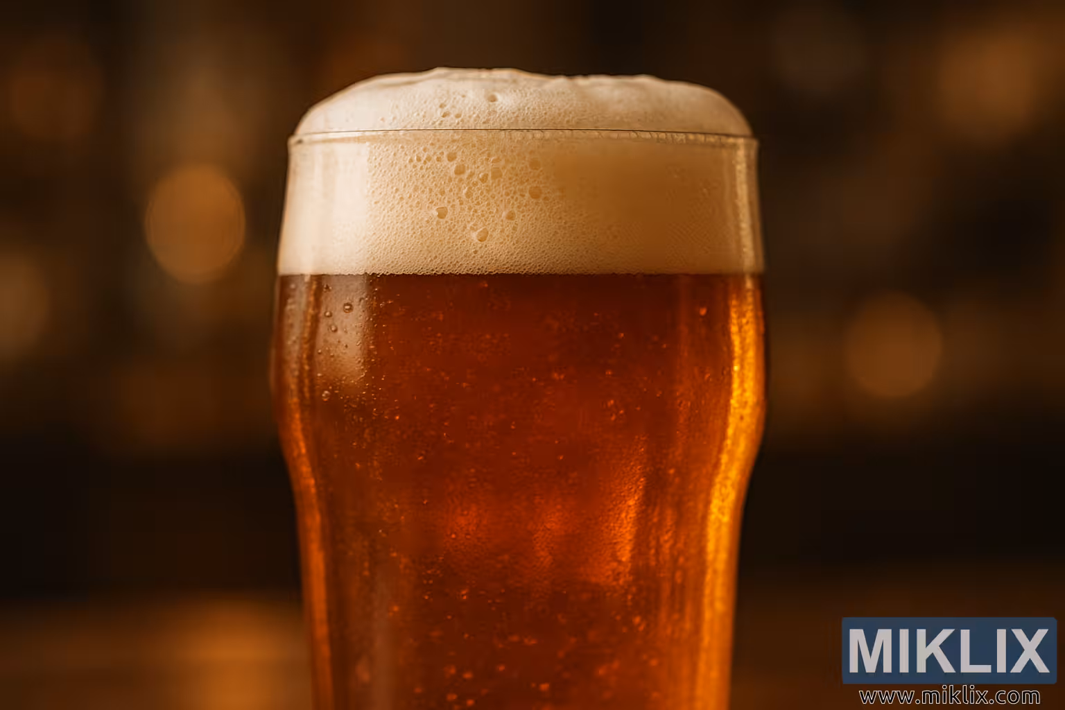 Bak ølet oppløses bakgrunnen i en uskarp gyllen bokeh, myk og utydelig, som om glasset står i en varmt opplyst pub eller et koselig hjem i skumringen. Denne defokuserte gløden bidrar til atmosfæren og skaper en aura av komfort, selskapelighet og letthet. Det er en påminnelse om at øl, selv om det er et produkt av nitid vitenskap og kunst, også er en opplevelse ment å deles, nytes sakte eller nytes uformelt blant venner. Scenen ser ut til å eksistere utenfor tiden, innrammet mindre av sted enn av stemning, og fremkaller både varmen i selskapet og ensomheten i refleksjon.