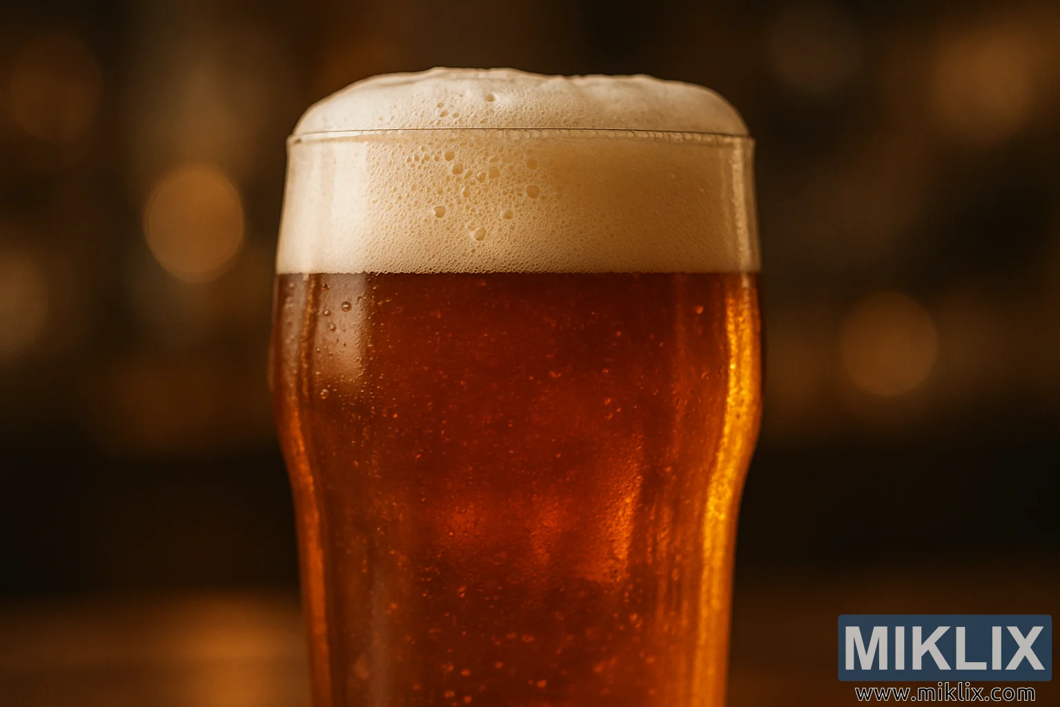 Bildet trekker øyet inn i hjertet av et enkelt glass øl, en ravfarget kreasjon som ser ut til å gløde med sin egen stille utstråling. Fokuset er intimt, som om det inviterer betrakteren til å stoppe opp og sette pris på de finessene i håndverket som er nedfelt i denne halvliteren. Ved første øyekast er det mest slående elementet skumkronen som hviler på toppen av glasset – et tykt, kremet skum som er både mykt og strukturert, med skummende bobler tett sammenvevd for å skape en tekstur som vitner om friskhet og balanse. Skummet fanger lyset i delikate høydepunkter, nesten som blonder strukket over kanten, og lover en første slurk som vil dekke ganen med glatthet før den gir etter for kompleksiteten under.