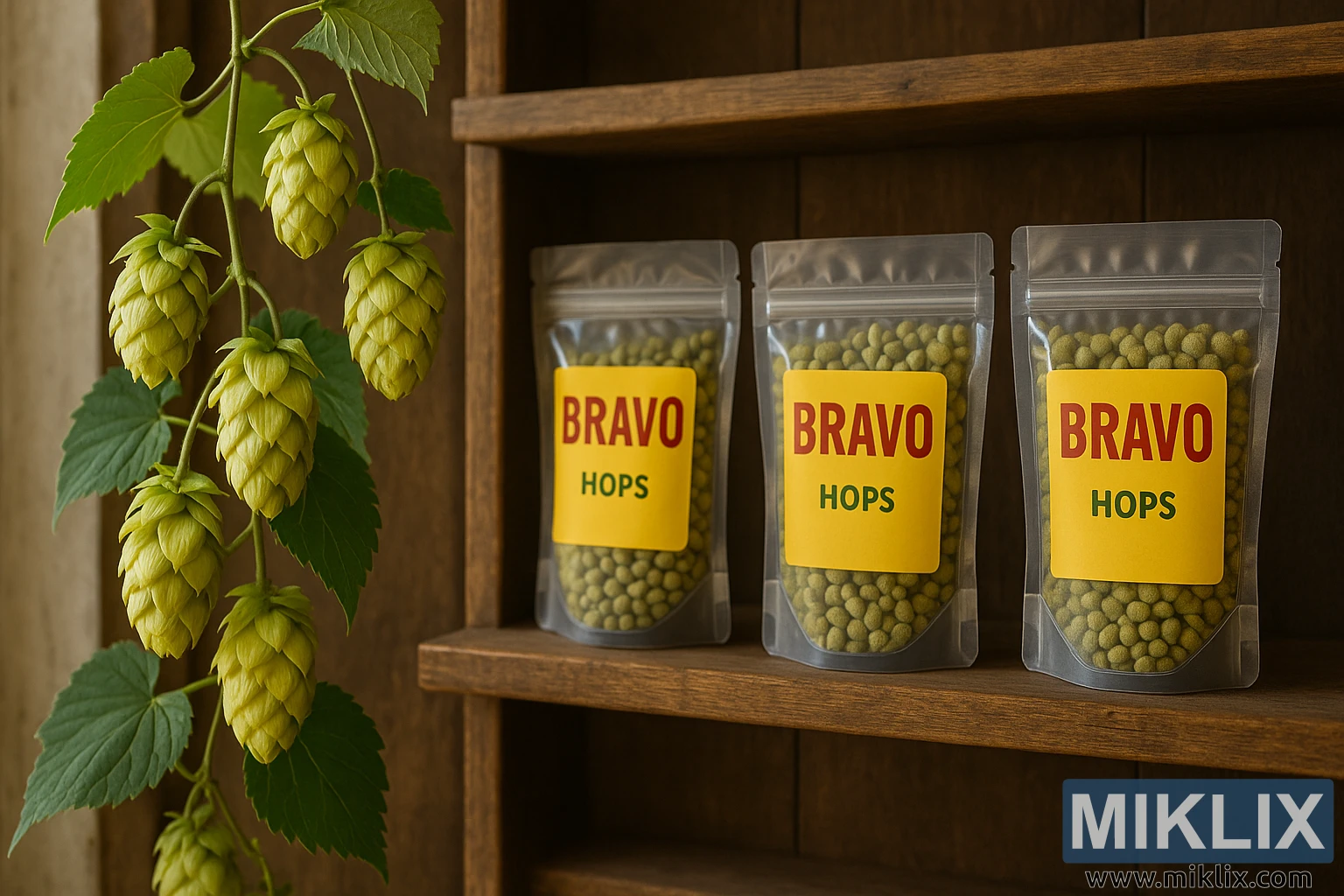 Et rustikk motiv med fargerike Bravo-humlekjegler som henger på en slyngplante ved siden av pent merkede poser med humlepellets på trehyller.