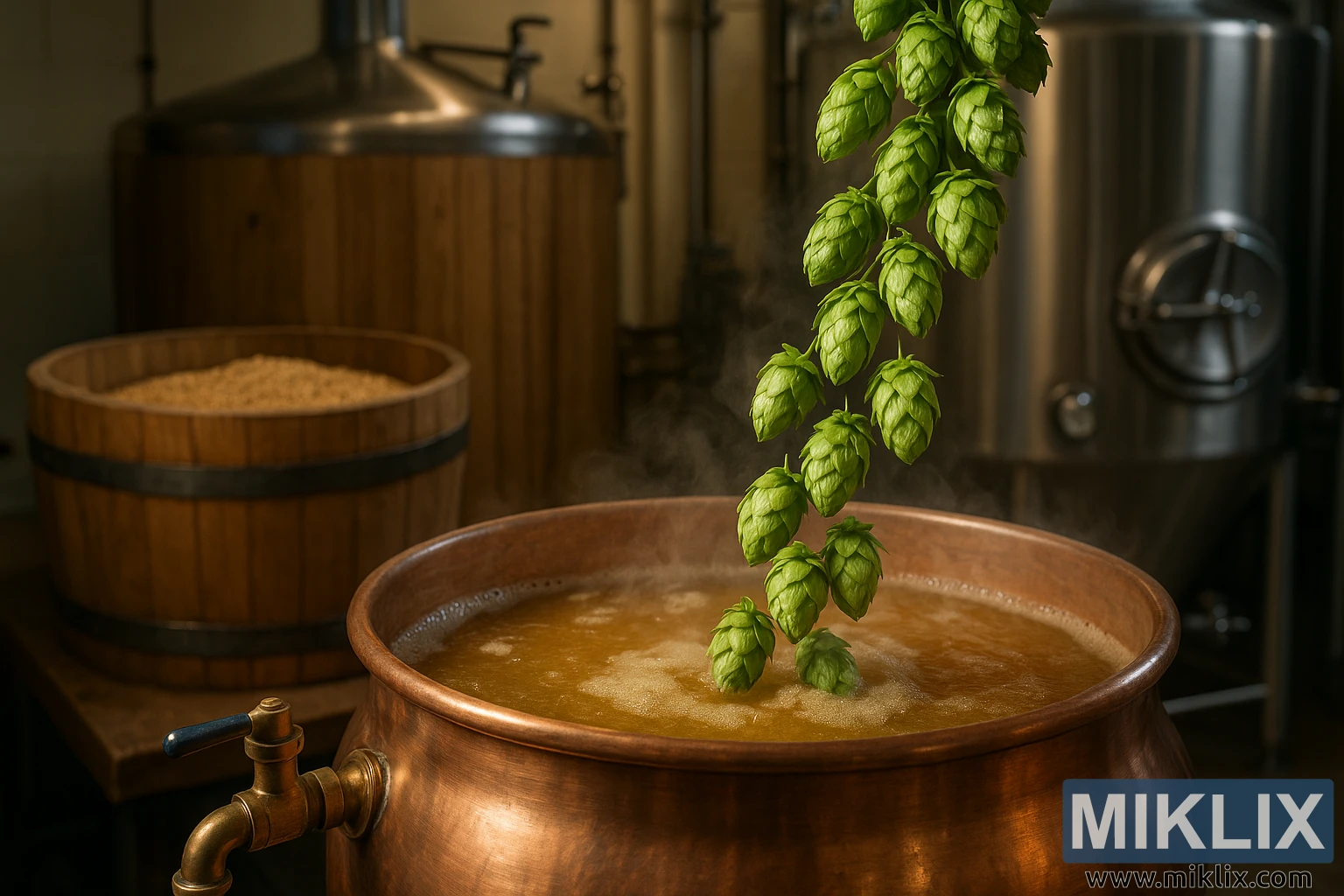 Atmosfæren i scenen er preget av harmoni, hvor hvert element – fra det glødende kobberet til den grønne humlekaskaden, fra dampen som stiger over vørteren til kornet som hviler tålmodig i nærheten – bidrar til en helhetlig følelse av ærbødighet og mening. Belysningen er myk og jevn, og fremhever teksturen til hver overflate og materiale uten å overvelde dem. Den skaper en stemning av varme og fokus, og legger ikke bare vekt på de fysiske ingrediensene, men også den uhåndgripelige kunsten som vever dem sammen. Det som kommer frem i dette bildet er mer enn en teknisk skildring av brygging. Det er en meditasjon over håndverket, en feiring av hundreårshumlen og dens unike evne til å forme den sensoriske opplevelsen av øl, og en hyllest til bryggerne som viderefører en tidløs tradisjon samtidig som de kontinuerlig foredler den med omhu og kreativitet.