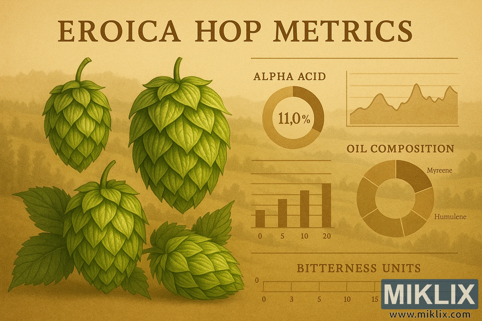 En detaljert digital illustrasjon av Eroica-humlekjegler med diagrammer som viser alfasyrer, oljesammensetning og bitterhetsmålinger mot en varmfarget bakgrunn.