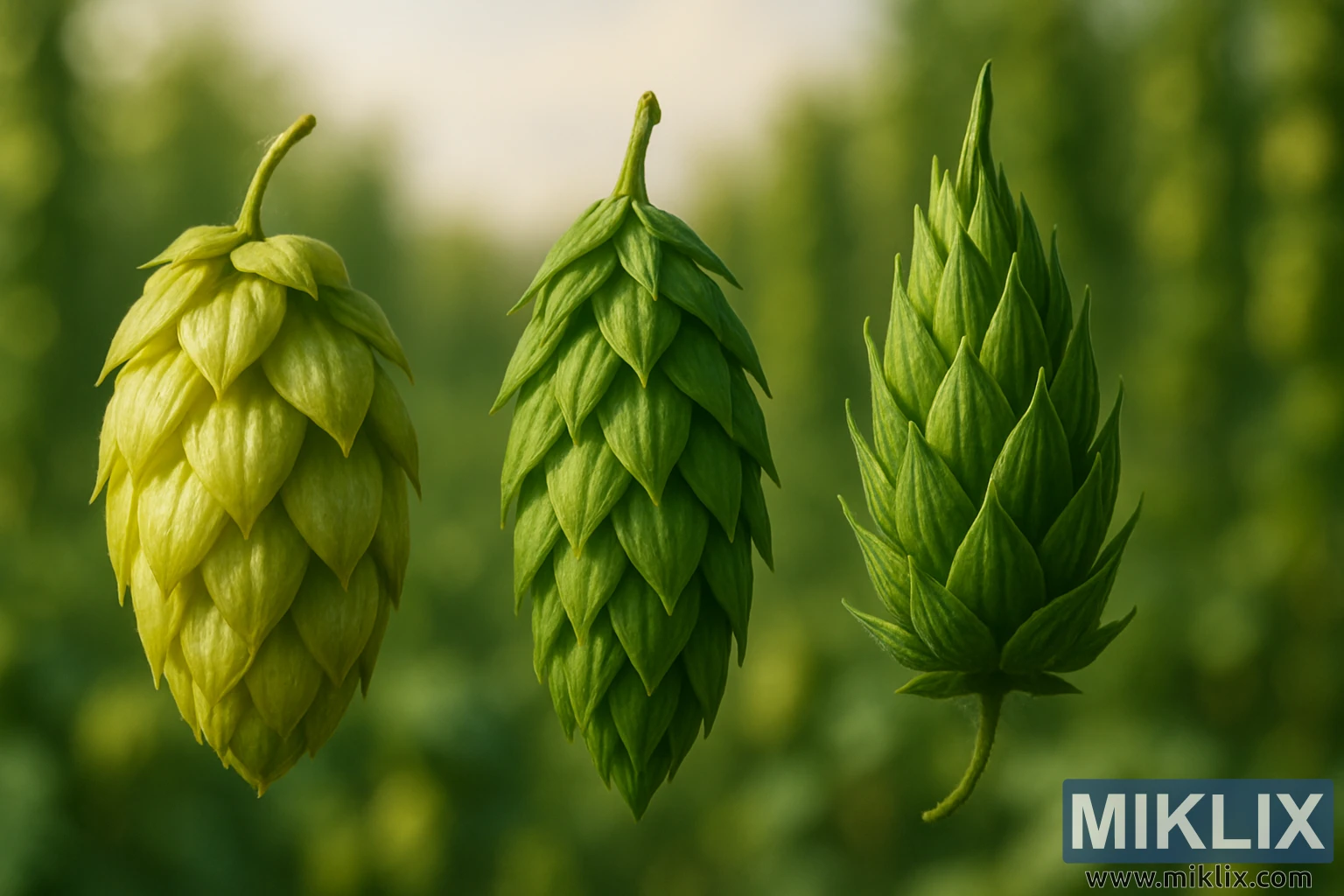 Til høyre skiller den tredje kjeglen seg ut med slående slankhet og definisjon. Dekselbladene er smalere og mer spisse, og stables tett i en søyle som kulminerer i en skarp, oppovervendt tupp. Grønnfargen her er dypere, friskere, nesten kraftigere enn de andre, noe som antyder en humle som fortsatt er ungdommelig, energisk og muligens høstet litt tidligere. Formen utstråler presisjon og intensitet, og fremkaller smaker som kanskje heller mer mot urteskarphet, sterk krydder eller ren bitterhet. Der kjeglen lengst til venstre fremkaller varme og fylde, og den midterste kjeglen balanserer, antyder dette eksemplaret lengst til høyre raffinement, klarhet og en viss djervhet i karakteren.