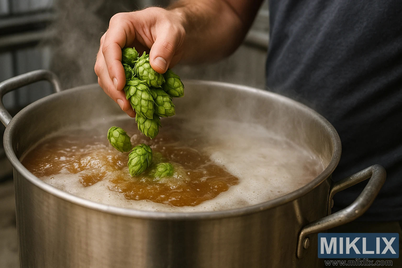 Bildet fanger et intimt og dynamisk øyeblikk i hjemmebryggingskunsten: det nøyaktige øyeblikket når friske, grønne humlekjegler føres inn i en kraftig kokende kjele med vørter. Betrakterens øye trekkes umiddelbart mot bryggerens hånd, balansert midt i en bevegelse, mens den forsiktig slipper en liten klynge humle ned i den kvernende ravfargede væsken. Kjeglene, livlige og nesten glødende med sin naturlige grønne livlighet, står i slående kontrast til den virvlende, skummende overflaten av vørteren nedenfor. En kjegle har allerede sklidd ut av bryggerens grep, fanget i luften mens den synker ned mot de boblende dypene, og forsterker følelsen av umiddelbarhet og bevegelse i bildet. Selve hånden, detaljert og lett solbrun, taler til en personlig forbindelse med prosessen – stødig, selvsikker og øvd i den delikate balansen mellom timing og intuisjon som kreves for god brygging.