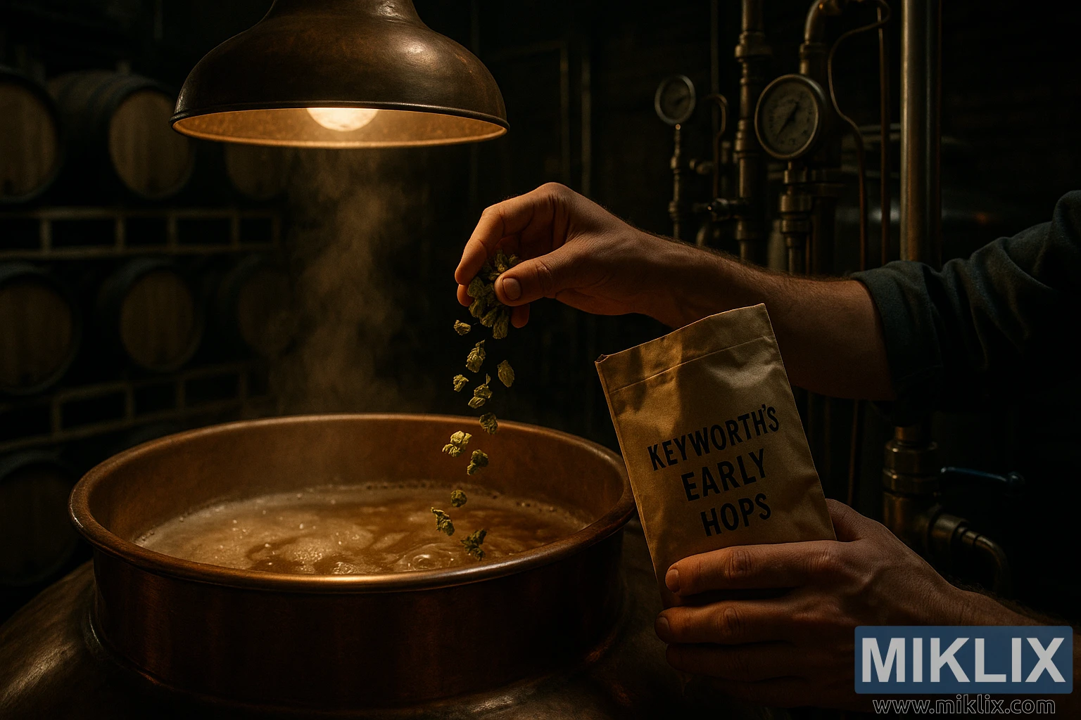 En brygger legger Keyworth-humle til en kobberkjele i et dunkelt bryggeri, omgitt av intrikate bryggemaskiner og eikefat, og fremhever håndverk.