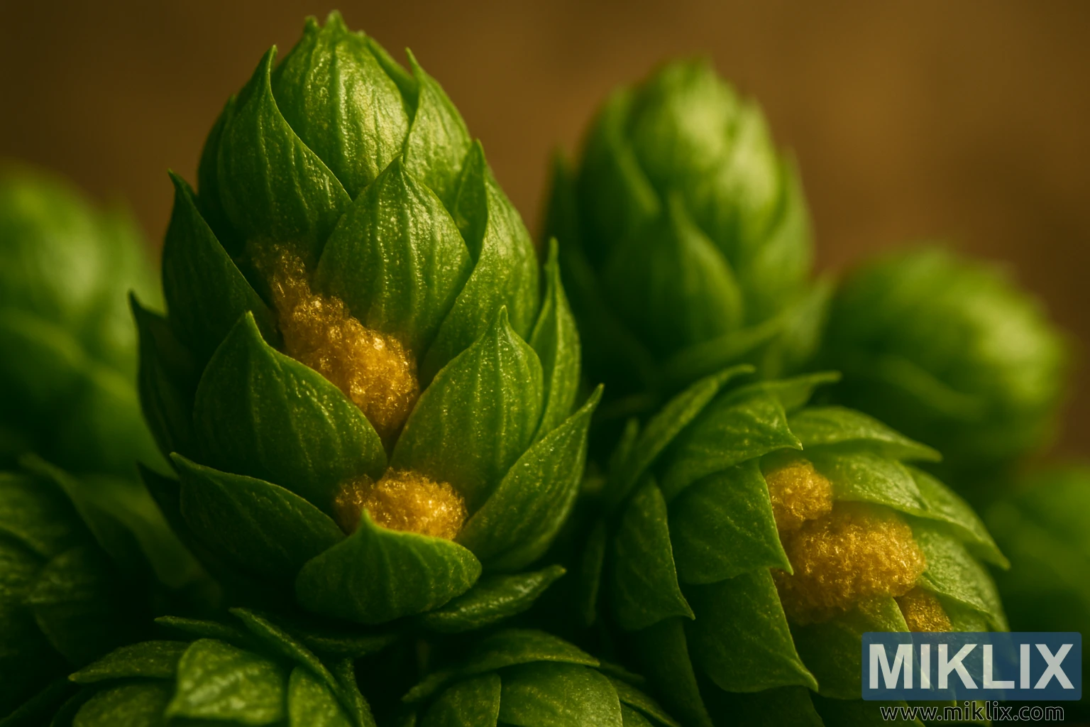 Fotografiet gir et ekstraordinært makrobilde av hjertet av en av bryggingens viktigste ingredienser: humlekjeglen. I denne skalaen trekkes betrakteren inn i den intime verdenen av plantens intrikate arkitektur, hvor de livlige grønne bladene skreller av og avslører skatten som er skjult inni – tette klynger av gyllengule lupulinkjertler. Disse små, harpiksholdige sekkene glitrer under den varme, gyldne studiobelysningen, deres kornete tekstur er nesten krystallinsk, som om de inneholder en hemmelig alkymi. Sannheten er at de gjør det: lupulin er humlens livsnerve, reservoaret av essensielle oljer og bitterstoffer som definerer smaken, aromaen og karakteren til øl. Å se det så tydelig eksponert i kjeglens folder forvandler et allerede vakkert naturobjekt til noe nesten magisk, en påminnelse om hvor mye kompleksitet og rikdom som kan rommes i noe så lite.