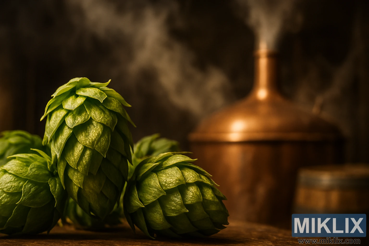 Bak humlen byr bakgrunnen på et landskap gjennomsyret av tradisjon. En polert kobberbryggkjele stiger opp fra skyggene, overflaten glimrer mykt i det svake lyset og utstråler både historie og håndverk. Fra den høye halsen krøller dampstrå seg opp i luften og løser seg opp i rommets mørkere avkroker, og hinter til alkymien som finner sted der inne. Denne dampen representerer transformasjon, punktet der råingrediensene – vann, malt og snart humle – begynner sin reise mot å bli øl. Ved siden av kan man skimte omrisset av et meskekar, en påminnelse om de tidligere trinnene i bryggeprosessen, der korn ble bløtlagt for å lage den sukkerholdige vørteren som nå kokes. Den uskarpe dybdeskarpheten sikrer at selv om disse bryggekarene etablerer kontekst, konkurrerer de ikke med humlen om oppmerksomhet. I stedet fungerer de som en scene og forsterker forbindelsen mellom ingrediens og prosess, tradisjon og håndverk.