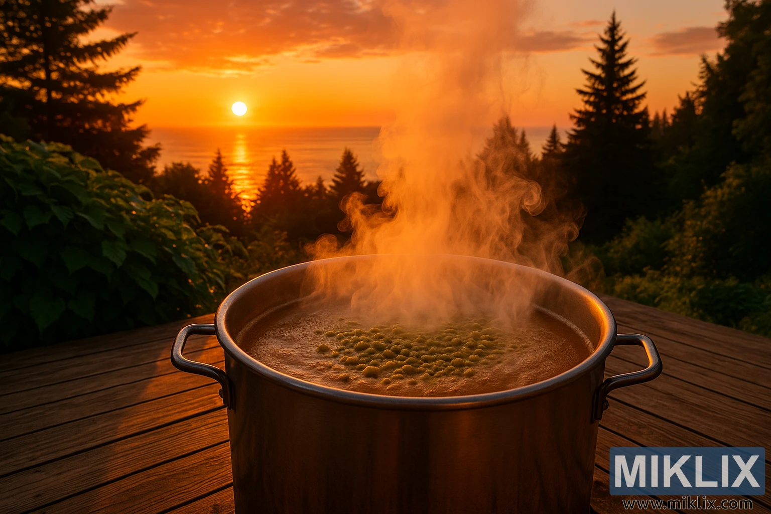Bildet viser en fantastisk soloppgang over Stillehavet som utfolder seg over et rustikt utendørs bryggemiljø, hvor kunstnerisk håndverksøl harmonerer med naturens storhet. I forgrunnen dominerer en stor, værbitt bryggkjele i rustfritt stål som står plassert på en gammel treterrasse. Kjelen er full av kraftig kokende vørter, og dens bølgende overflate er preget av klynger av livlige grønne humlepellets som bobler og virvler i den turbulente væsken. Fra den kvernende overflaten stiger dampstråler opp i myke, krøllete fjærer, som vrir seg og driver mot himmelen som eteriske bånd. Dampen fanger det varme, vinklede lyset fra soloppgangen, gløder mykt rundt kantene og skaper et drømmeaktig slør over kjelen.