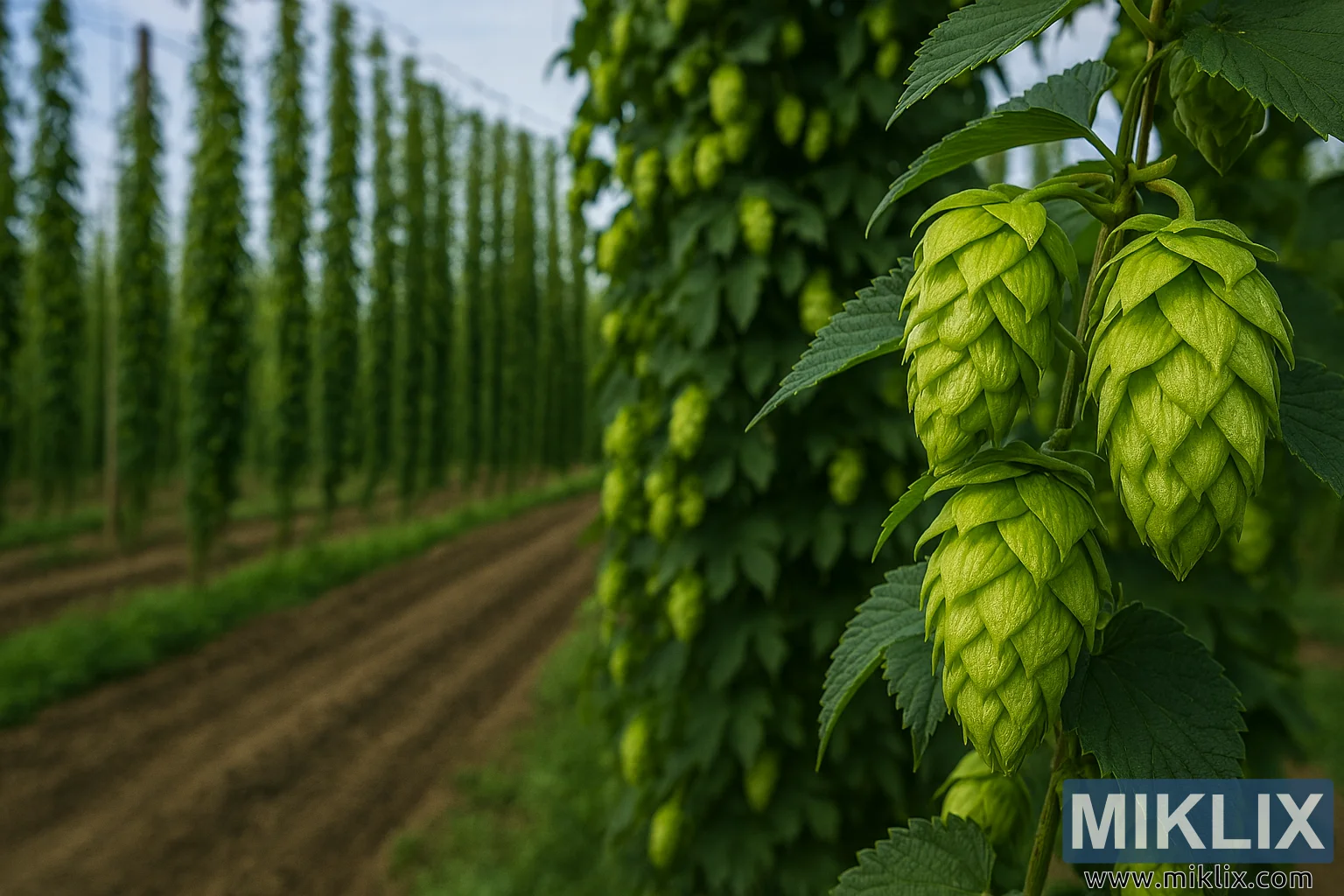 I bakgrunnen fortsetter humleplantene å stige langs espalierene, og forsvinner gradvis til en svak uskarphet på grunn av den lave dybdeskarpheten. Denne fotografiske teknikken trekker oppmerksomheten mot konglene i forgrunnen samtidig som den formidler skalaen og strukturen til hele åkeren. Himmelen over er lyseblå med små skyer i høyden, noe som gir en fredfull atmosfære til komposisjonen.