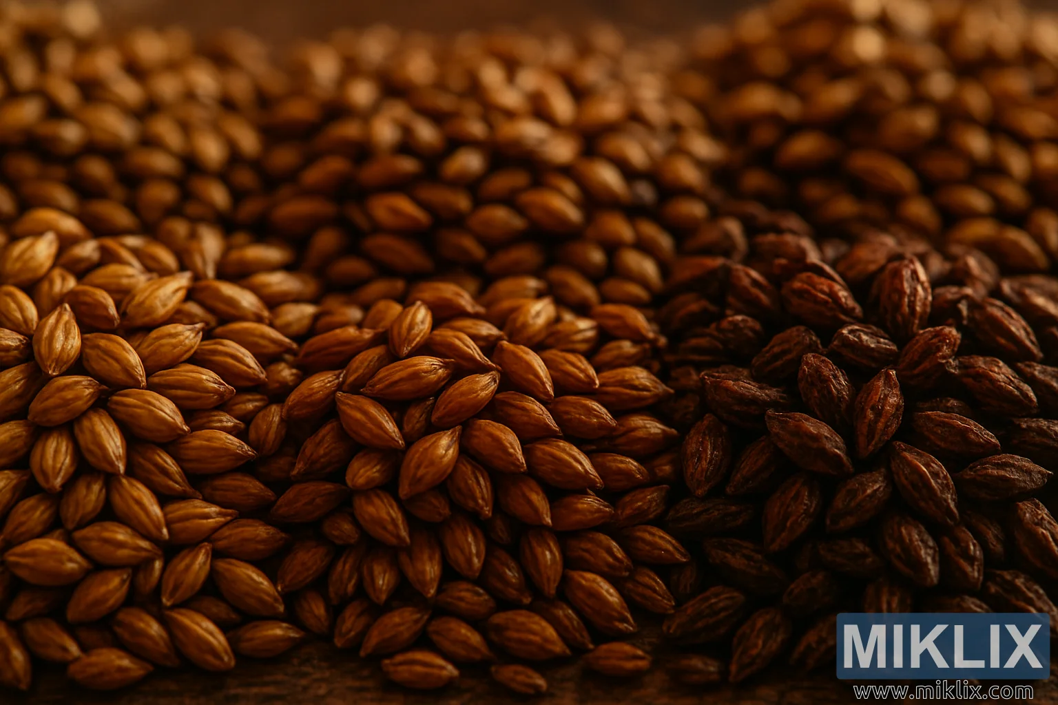 Mellomgrunnen fortsetter denne gradienten av farge og kompleksitet, med flere maltvarianter arrangert på en måte som føles både organisk og bevisst. Kornene er litt mer spredt her, slik at betrakteren kan sette pris på individuelle kjerner og deres unike egenskaper. Noen er rundere, andre mer avlange, og overflatene deres varierer fra glatte til lett steinete. Dette mangfoldet understreker utvalget av muligheter som er tilgjengelige for bryggere, som velger malt ikke bare for fargen, men også for deres enzymatiske aktivitet, gjærbarhet og smaksbidrag.