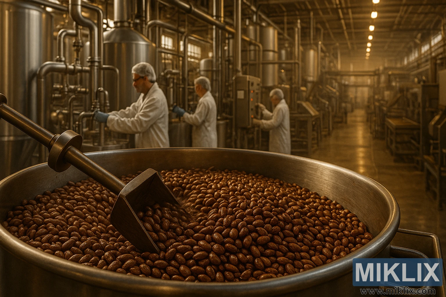 Industrielt sjokolademaltanlegg med steketrommel, arbeidere som overvåker målere og rustfrie kar, som fremhever presisjonen og håndverket til maltproduksjon.