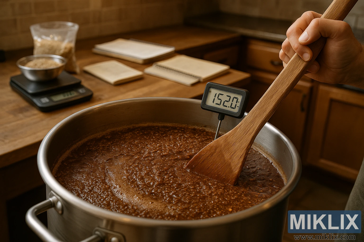 Dette bildet er mer enn et øyeblikksbilde av hjemmebrygging – det er et portrett av dedikasjon, av den stille gleden som finnes i å forvandle rå ingredienser til noe meningsfullt. Det fanger essensen av å mose sjokolademalt, en prosess som krever oppmerksomhet på detaljer og en dyp forståelse av hvordan smak utvikler seg. Verktøyene, temperaturen, notene og aromaen bidrar alle til en fortelling om omsorg og håndverk. På dette kjøkkenet er brygging ikke bare en hobby – det er et ritual, en dialog mellom brygger og brygg, hvor hvert trinn er en sjanse til å lære, foredle og nyte.