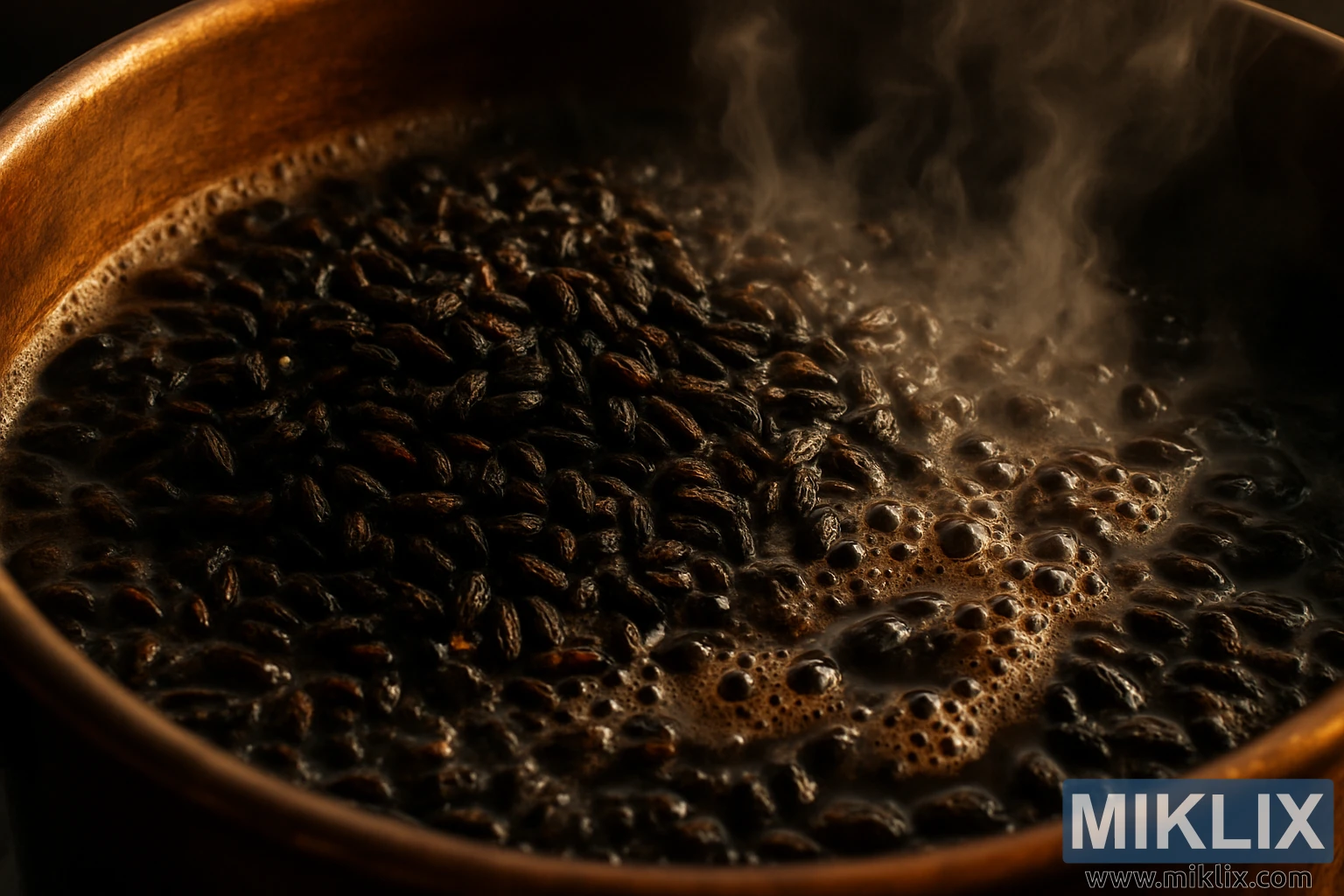 Nærbilde av mørkbrent malt som damper i en kobberkjele, glødende rav med intense aromaer av brent toast og bitterhet, og fanger bryggekompleksiteten.